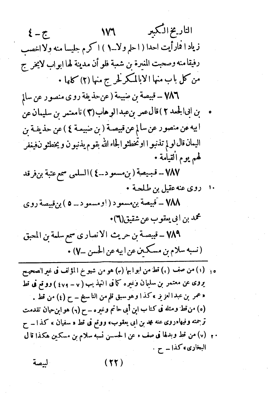 786 - قبيصة بْن ضبيعة (عَنْ حذيفة روى منصور عَنْ سالم بْن أَبِي الجعد 2) قَالَ عُمَر بْن عَبْد الوهاب (3) نا معتمر بْن سُلَيْمَان عَنْ أَبِيه عَنْ منصور عَنْ سالم عَنْ قبيصة (بْن ضبيعة 4) عَنْ حذيفة بْن اليمان قَالَ لو لم تذنبوا أو تخطئوا لجاء اللَّه بقوم يذنبون ويخطئون فيغفر لَهُم يوم القيامة.