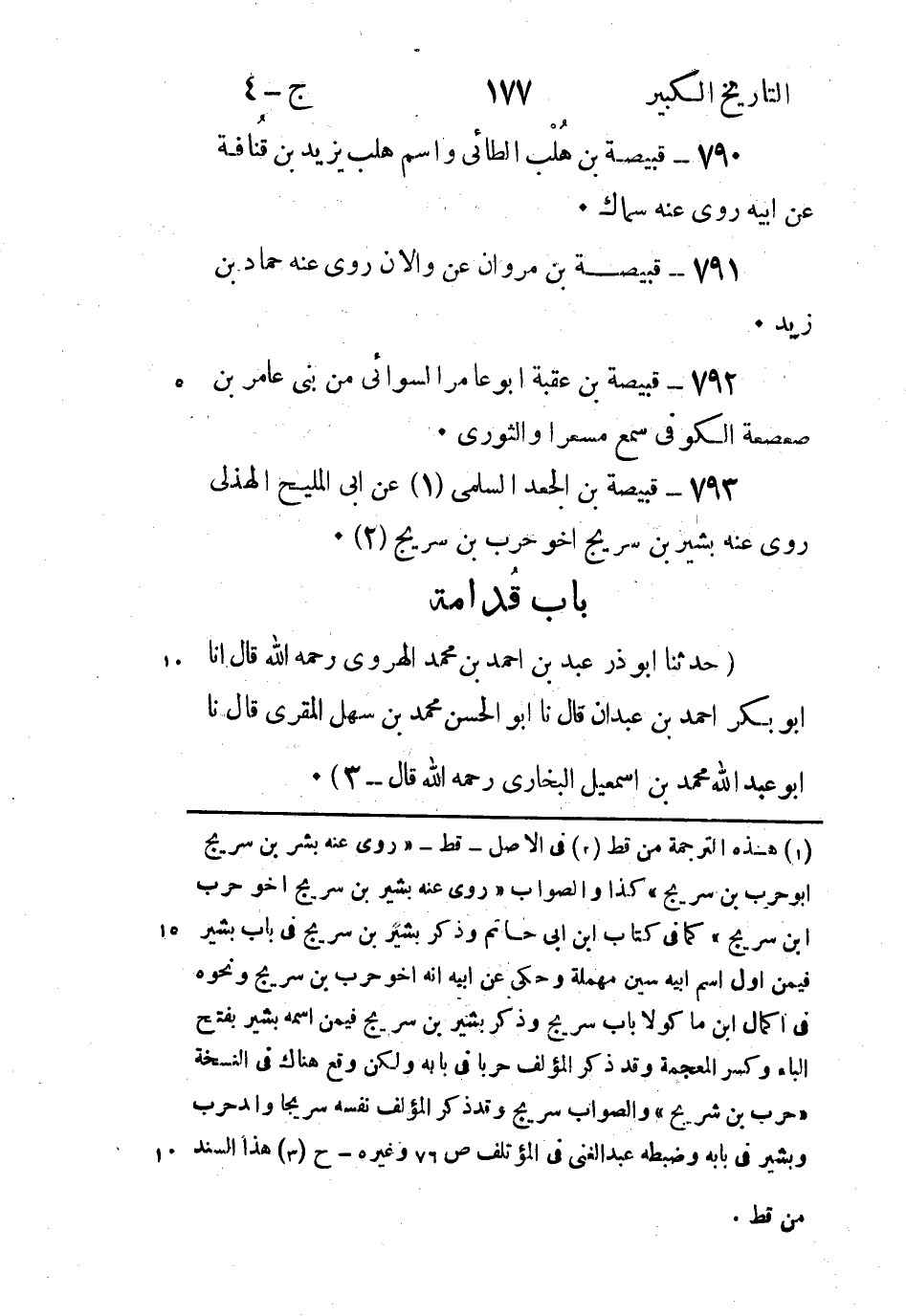 باب قدامة (حَدَّثَنَا أَبُو ذر عَبْد بْن أَحْمَد بْن مُحَمَّد الهروي رحمه اللَّه قَالَ أنا أَبُو بكر أَحْمَد بْن عبدان قَالَ نا أَبُو الْحَسَن مُحَمَّد بْن سهل المقري قَالَ نَا أَبُو عَبْدِ اللَّهِ مُحَمَّدُ بْنُ اسمعيل البخاري رحمه الله قال - 3) .