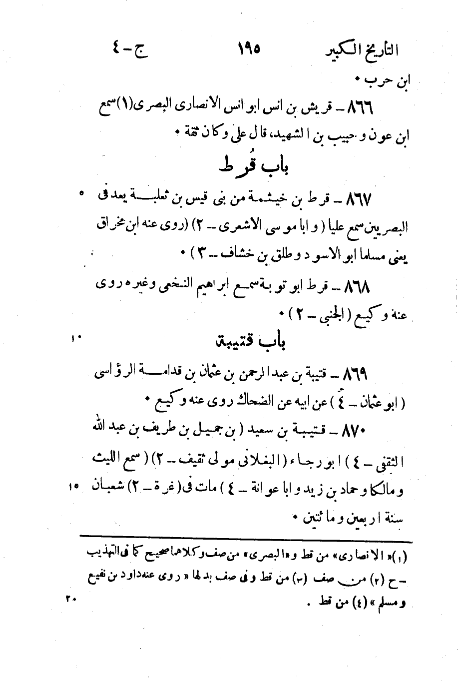870 - قتيبة بْن سَعِيد (بْن جميل بْن طريف بْن عَبْد اللَّه الثقفِي - 4) أَبُو رجاء (البغلاني مولى ثقيف - 2) (سَمِعَ الليث ومالكا وحماد بْن زيد وأبا عوانة - 4) مات فِي (غرة - 2) شعبان سنة أربعين ومائتين.