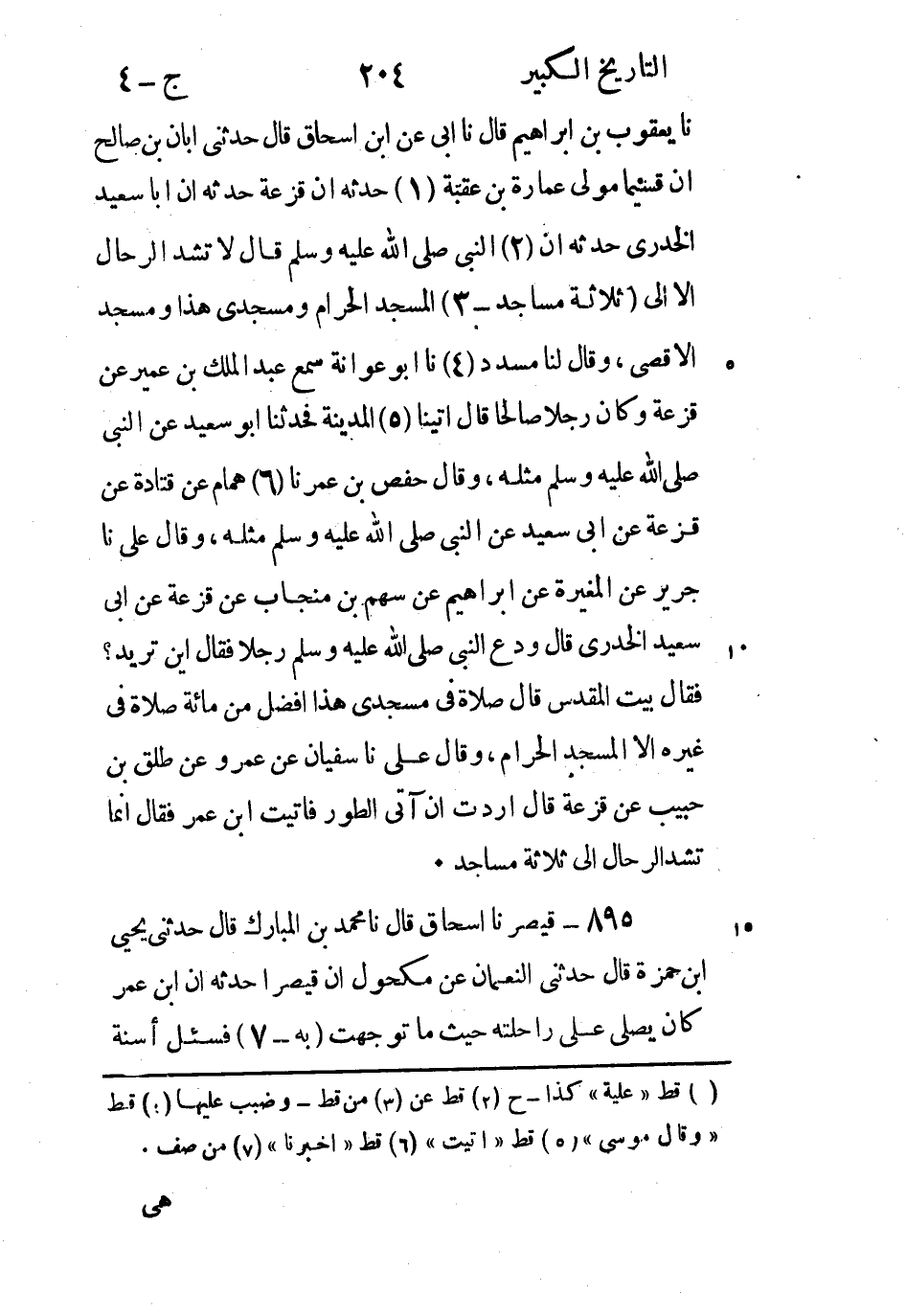 نَا يَعْقُوبُ بْن إِبْرَاهِيم قَالَ نَا أَبِي عَنِ ابْنِ إِسْحَاقَ قَالَ حَدَّثَنِي أَبَانُ بْنُ صَالِحٍ أَنَّ قُسَيْمًا مَوْلَى عُمَارَةَ بْنِ عُقْبَةَ (1) حَدَّثَهُ أَنَّ قَزْعَةَ حَدَّثَهُ أَنَّ أَبَا سَعِيدٍ الْخُدْرِيَّ حَدَّثَهُ أَنَّ (2) النَّبِيَّ صَلَّى اللَّهُ عَلَيْهِ وَسَلَّمَ قَالَ لا تُشَدُّ الرِّحَالُ إِلا إِلَى (ثَلاثَةِ مَسَاجِدَ - 3) الْمَسْجِدِ الْحَرَامِ وَمَسْجِدِي هَذَا وَمَسْجِدِ الأَقْصَى، وقَالَ لَنَا مُسَدَّدٌ (4) نا أَبُو عَوَانَةَ سَمِعَ عَبْدَ الْمَلِكِ بْنَ عُمَيْرٍ عَنْ قَزَعَةَ وَكَانَ رَجُلا صَالِحًا قَالَ أَتَيْنَا (5) الْمَدِينَةَ فَحَدَّثَنَا أَبُو سَعِيدٍ عَنِ النَّبِيِّ صَلَّى اللَّهُ عَلَيْهِ وَسَلَّمَ مِثْله، وقَالَ حَفْصُ بْن عُمَر نا (6) هَمَّامٌ عَنْ قَتَادَةَ عَنْ قَزَعَةَ عَنْ أَبِي سَعِيدٍ عَنِ النَّبِيِّ صَلَّى اللَّهُ عَلَيْهِ وَسَلَّمَ مِثْله، وقَالَ علي نا جرير عَنِ المغيرة عن إبراهيم عن سهم بن منجاب عن قزعة عَنْ أَبِي سَعِيد الخدري قَالَ ودع النَّبِيّ صَلَّى اللَّهُ عَلَيْهِ وَسَلَّمَ رجلا فَقَالَ أين تريد؟ فَقَالَ بيت المقدس قَالَ صلاة فِي مسجدي هذا أفضل من مائة صلاة فِي غيره إلا المسجد الحرام، وقَالَ علي نا سُفْيَان عَنْ عَمْرو عَنْ طلق بْن حبيب عَنْ قزعة قَالَ أردت أن آتي الطور فاتيت ابن عُمَر فَقَالَ إنما تشد الرحال إلى ثلاثة مساجد.