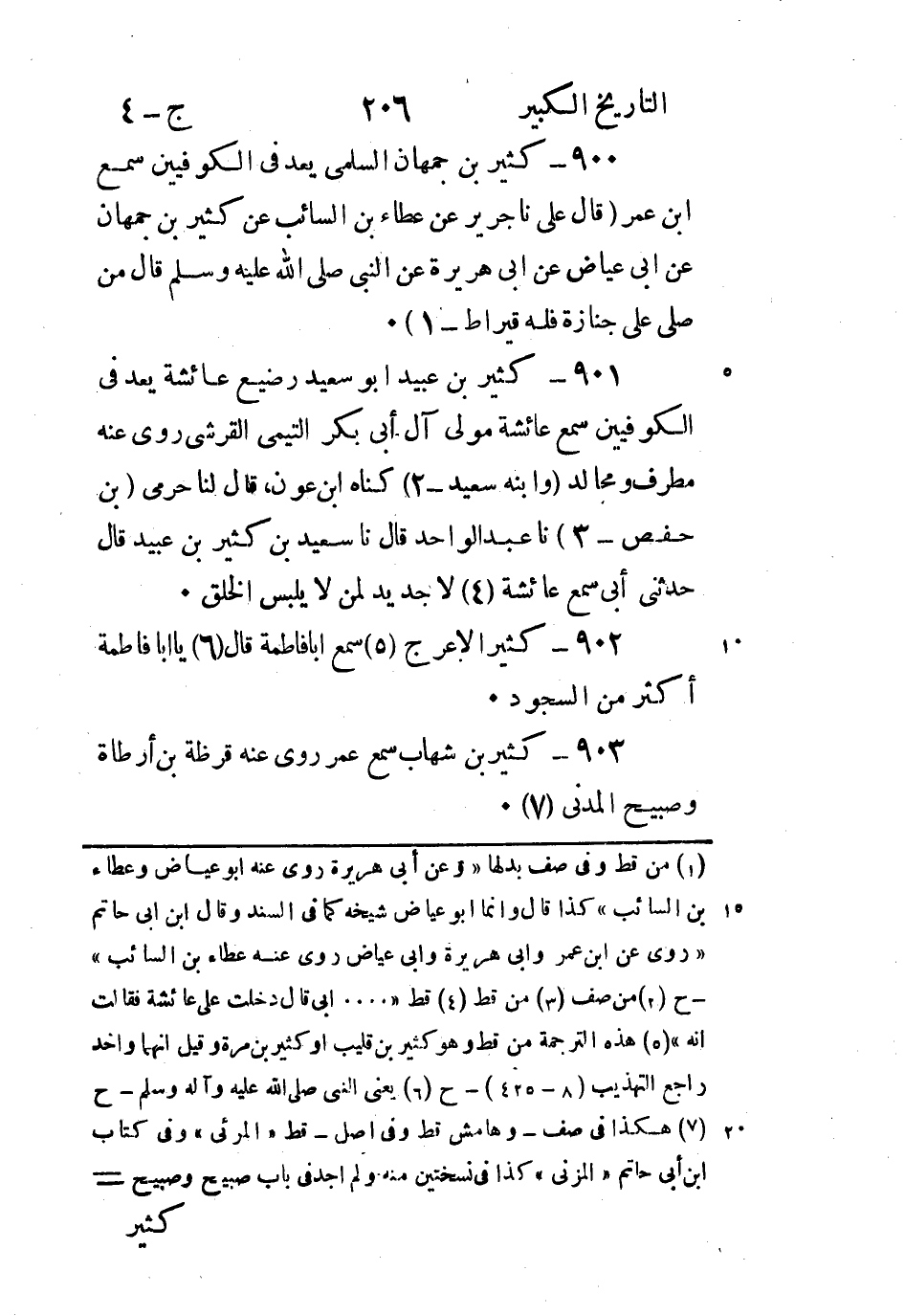 901 - كثير بْن عُبَيْد أَبُو سَعِيد رضيع عَائِشَةَ يعد فِي الكوفِيين سَمِعَ عَائِشَةَ مولى آل أَبِي بكر التيمي الْقُرَشِيّ روى عنه مطرف ومجالد (وابنه سعيد - 2) كناه ابن عون، قَالَ لنا حرمي (بْن حفص - 3) نا عَبْد الواحد قَالَ نا سَعِيد بْن كثير بْن عُبَيْد قَالَ حدثني أَبِي سَمِعَ عَائِشَةَ (4) لا جديد لمن لا يلبس الخلق.