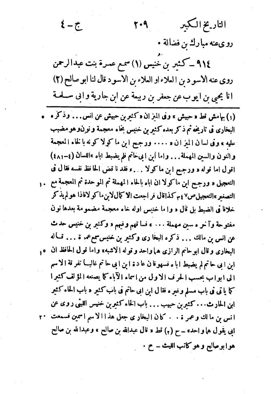 4 - 481) اقول اما قوله (ورجح ابن ماكولا..فقد ناقض الحافظ نفسه فقال في التعجيل (ورجح ابن ماكولا ان اباه بالحاء المهملة ثم الموحدة ثم المعجمة مع التصغير) التعجيل ص 347 كذا قال فراجعت الاكمال لابن ماكولا فإذا هو لم يذكر خلافا في الضبط بل قال (واما خنيس اوله خاء معجمة مضمومة بعدها نون مفتوحة وآخره سين مهملة..) فساقهم وفيهم (وكثير بن خنيس حدث عن انس بن مالك..ذكره البخاري وكثير بن خنيس سمع عمرة..قاله البخاري وقال أبو حاتم الرازي هما واحد وقوله الاشبه) واما قول الحافظ ان ابن ابى حاتم لم يضبط اباه فسهو فان عادة ابن ابى حاتم غالبا تفرقة الاسم إلى ابواب بحسب الحرف الاول من اسماء الآباء كما يصنعه المؤلف كثيرا كما ياتي في باب مسلم وغيره فقال ابن ابى حاتم في باب كثير (باب الحاء كثير ابن الحارث..كثير بن حبيب..باب الخاء كثير بن خنيس الليثى روى عن