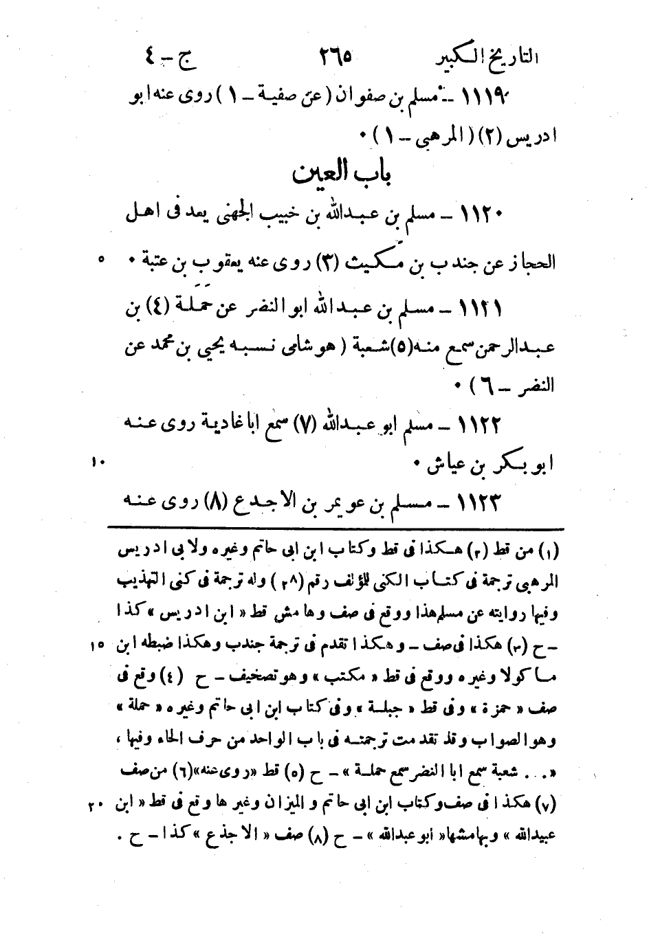 (1) من قط (2) هكذا في قط وكتاب ابن ابى حاتم وغيره ولابي ادريس المرهبى ترجمة في كتاب الكنى للمؤلف رقم (28) وله ترجمة في كنى التهذيب وفيها روايته عن مسلم هذا ووقع في صف وهامش قط (ابن ادريس) كذا - ح (3) هكذا في صف - وهكذا تقدم في ترجمة جندب وهكذا ضبطه ابن ماكولا وغيره ووقع في قط (مكتب) وهو تصحيف - ح (4) وقع في صف (حمزة) وفى قط (جبلة) وفى كتاب ابن ابى حاتم وغيره (حملة) وهو الصواب وقد تقدمت ترجمته في باب الواحد من حرف الحاء وفيها، (..شعبة سمع ابا النضر سمع حملة) - ح (5) قط (روى عنه) (6) من صف (7) هكذا في صف وكتاب ابن ابى حاتم والميزان وغيرها وقع في قط (ابن عبيد الله) وبهامشها (أبو عبد الله) - ح (8) صف (الاجذع) كذا - ح.