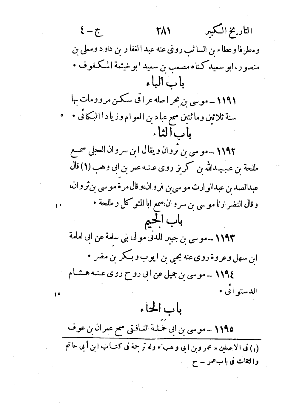 1191 - مُوسَى بْن بحر أصله عراقي سكن مرو ومات بها سنة ثلاثين ومائتين سَمِعَ عباد بْن العوام وزياد البكائي.