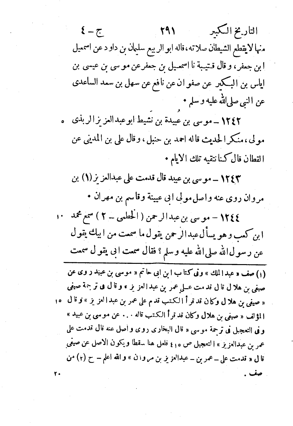 1242 - مُوسَى بْن عُبَيْدة بْن نشيط أَبُو عَبْد العزيز الربذي مولى، منكر الحديث قَالَه أَحْمَد بْن حنبل، وقَالَ علي بْن المديني عَنِ القطان قَالَ كنا نتقيه تلك الأيام.