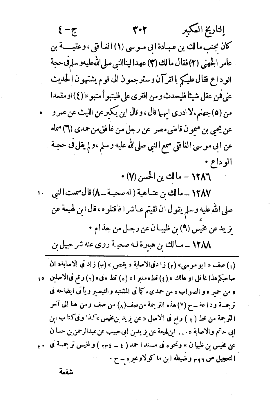 (1) صف (أبو موسى) (2) زاد في الاصابة (يقص) (3) زاد في الاصابة (ان صاحبكم هذا غافل أو هالك) (4) قط (منبرا) (5) قط (في) (6) وقع في الاصلين (من حمير) والصواب (من حمدى) كما في المشتبه والتبصير ويأتى ايضاحه في ترجمة وداعة - ح (7) هذه الترجمة من صف (8) من صف ومن هنا إلى آخر الترجمة من قط (9) وقع في الاصل (عن يزيد بن مخيس) كذا وفى كتاب ابن ابى حاتم والاصابة ( ... ابن لهيعة عَنْ يزيد بْن أَبِي حبيب عَنْ عَبْد الرحمن بن حسان عن مخيس بن ظبيان) ونحوه في مسند احمد (