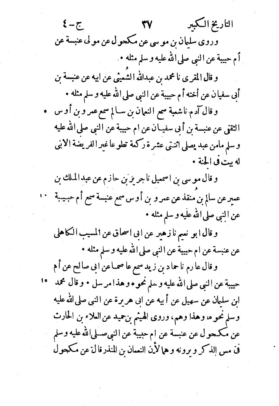 وَقَالَ مُوسَى بْن اسمعيل نا جرير بْن حازم عَنْ عَبْد الْمَلِك بْن عمير عَنْ سالم بْن منقذ عَنْ عَمْرو بْن أوس سَمِعَ عَنْبسة سَمِعَ أُمِّ حَبِيبَةَ عَنِ النَّبِيِّ صَلَّى اللَّهُ عَلَيْهِ وَسَلَّمَ مثلَهُ.