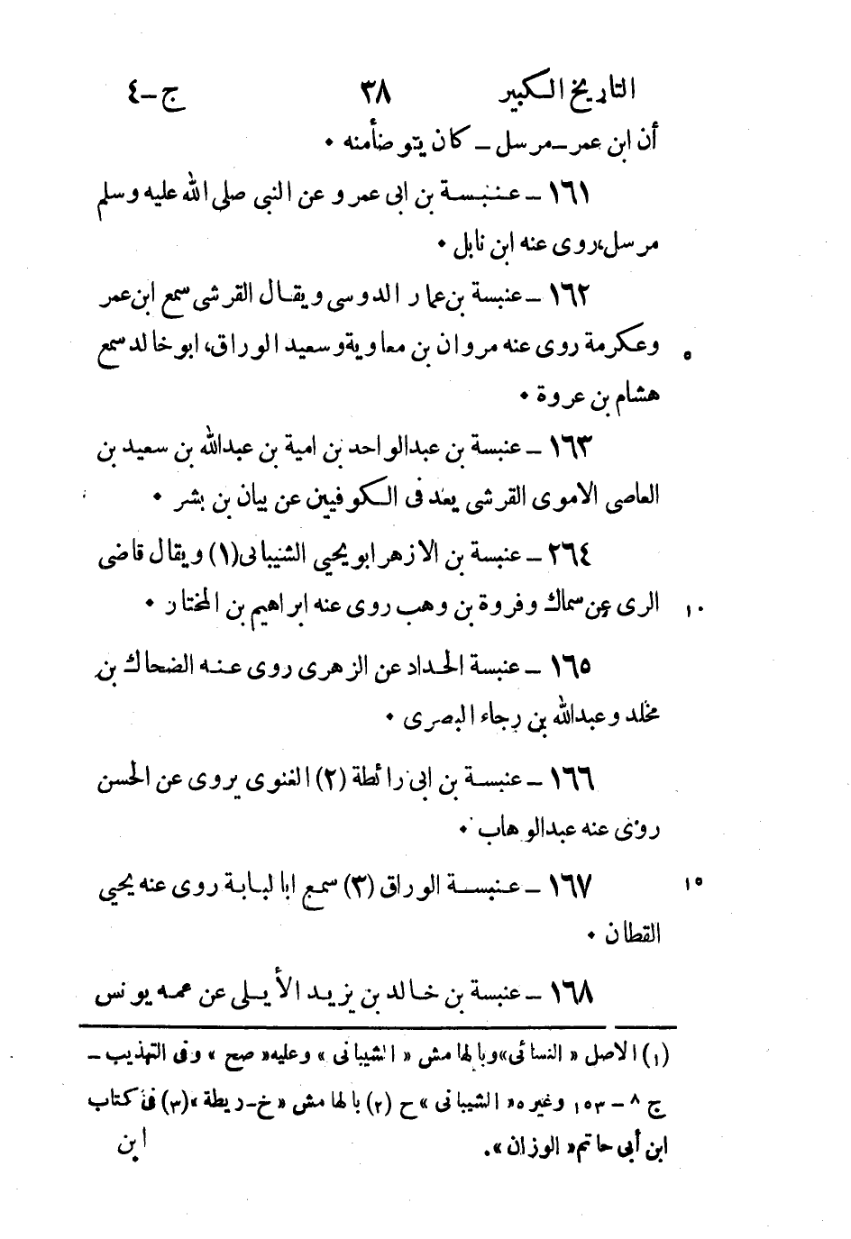 163 - عَنْبسة بْن عَبْد الواحد بْن أمية بْن عَبْد اللَّه بْن سَعِيد بْن العاصي الأموي الْقُرَشِيّ يعد فِي الْكُوفِيِّينَ عَنْ بيان بْن بشر.