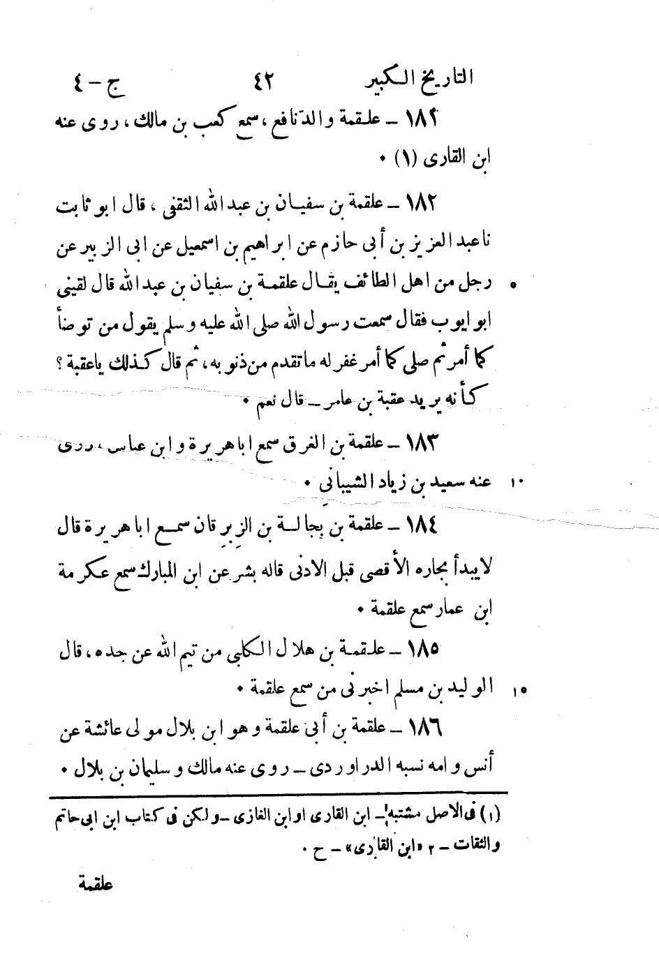 184 - علقمة بْن بجالة بْن الزبرقان سَمِعَ أَبَا هُرَيْرَةَ قَالَ لا يبدأ بجاره الأقصى قبل الأدنى قاله بشر عن ابن المبارك سمع عكرمة ابن عمار سَمِعَ علقمة.