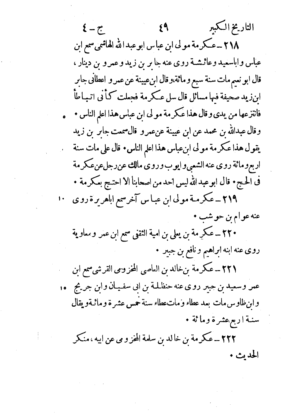 218 - عكرمة مولى ابن عَبَّاس أَبُو عَبْد اللَّه الْهَاشِمِيّ سَمِعَ ابْن عَبَّاس وأبا سَعِيد وعَائِشَة روى عَنْهُ جَابِر بْن زَيْد وَعَمْرو بْن دينار، قَالَ أَبُو نعيم مات سنة سبع ومائة، وَقَالَ ابْن عيينة عن عمرو اعطاني جابر ابن زَيْد صحيفة فِيهَا مسائل قَالَ سل عكرمة فجعلت كأني أتباطأ فانتزعها من يدي وَقَالَ هذا عكرمة مولى ابن عَبَّاس هذا أعلم الناس.