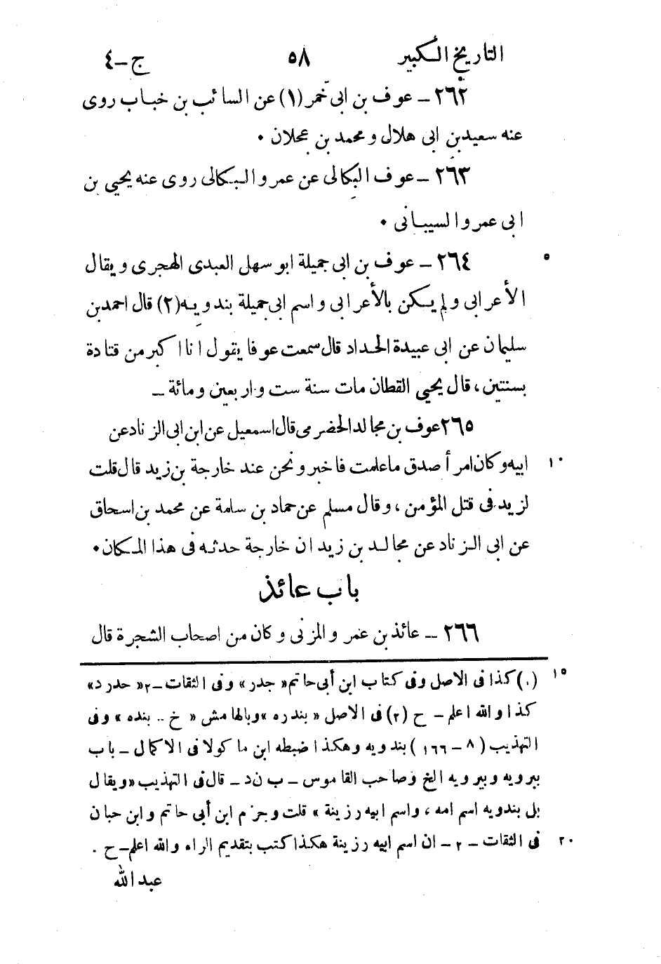 264 - عَوْف بْن أَبِي جميلة أَبُو سهل العبدي الْهِجْرِيّ ويقَالَ الأعرابي ولم يكن بالأعرابي واسم أَبِي جميلة بندويه (2) قَالَ أَحْمَد بْن سُلَيْمَان عَنْ أَبِي عُبَيْدة الحداد قَالَ سَمِعْتُ عوفا يَقُولُ أنا أكبر من قتادة بسنتين، قَالَ يَحْيَى القطان مات سنة ست وأربعين ومائة -