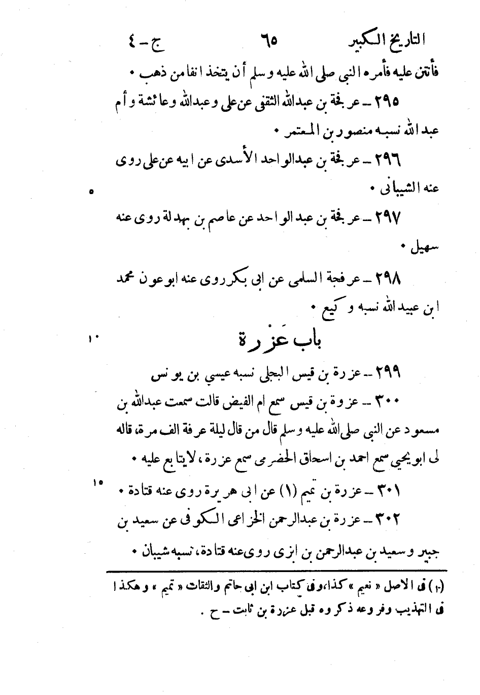 302 - عزرة بْن عَبْد الرَّحْمَن الخزاعي الكوفِي عَنْ سَعِيد بْن جُبَيْر وسَعِيد بْن عَبْد الرَّحْمَن بْن أبزي روى عنه قتادة، نسبه شيبان.