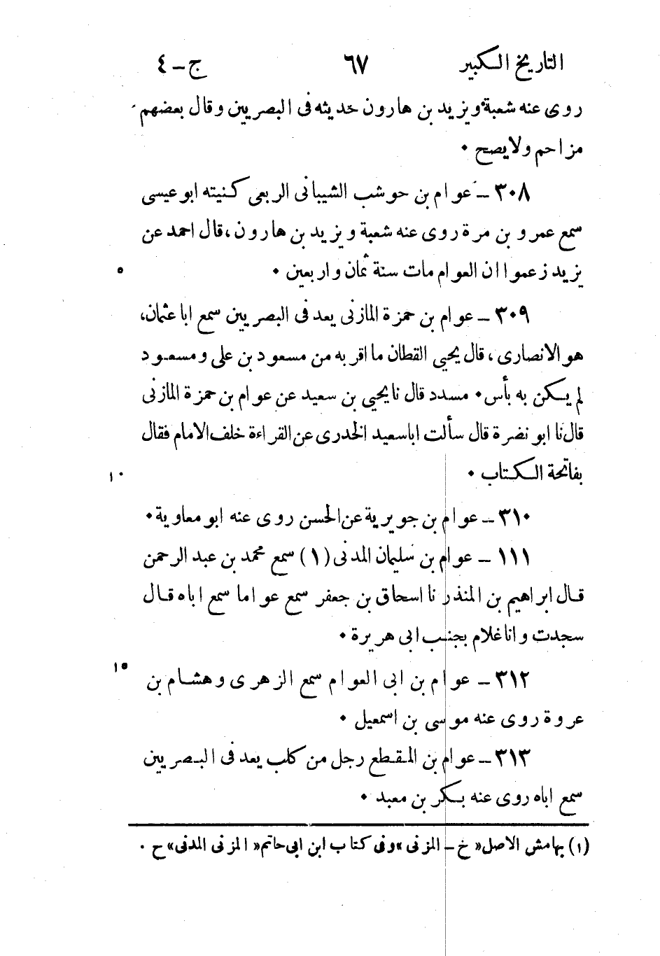 309 - عوام بْن حمزة المازني يعد فِي الْبَصْرِيِّينَ سَمِعَ أَبَا عثمان، هو الْأَنْصَارِيّ، قَالَ يَحْيَى القطان ما أقربِهِ من مَسْعُود بْن عَلِيّ ومَسْعُود لم يكن بِهِ بأس.