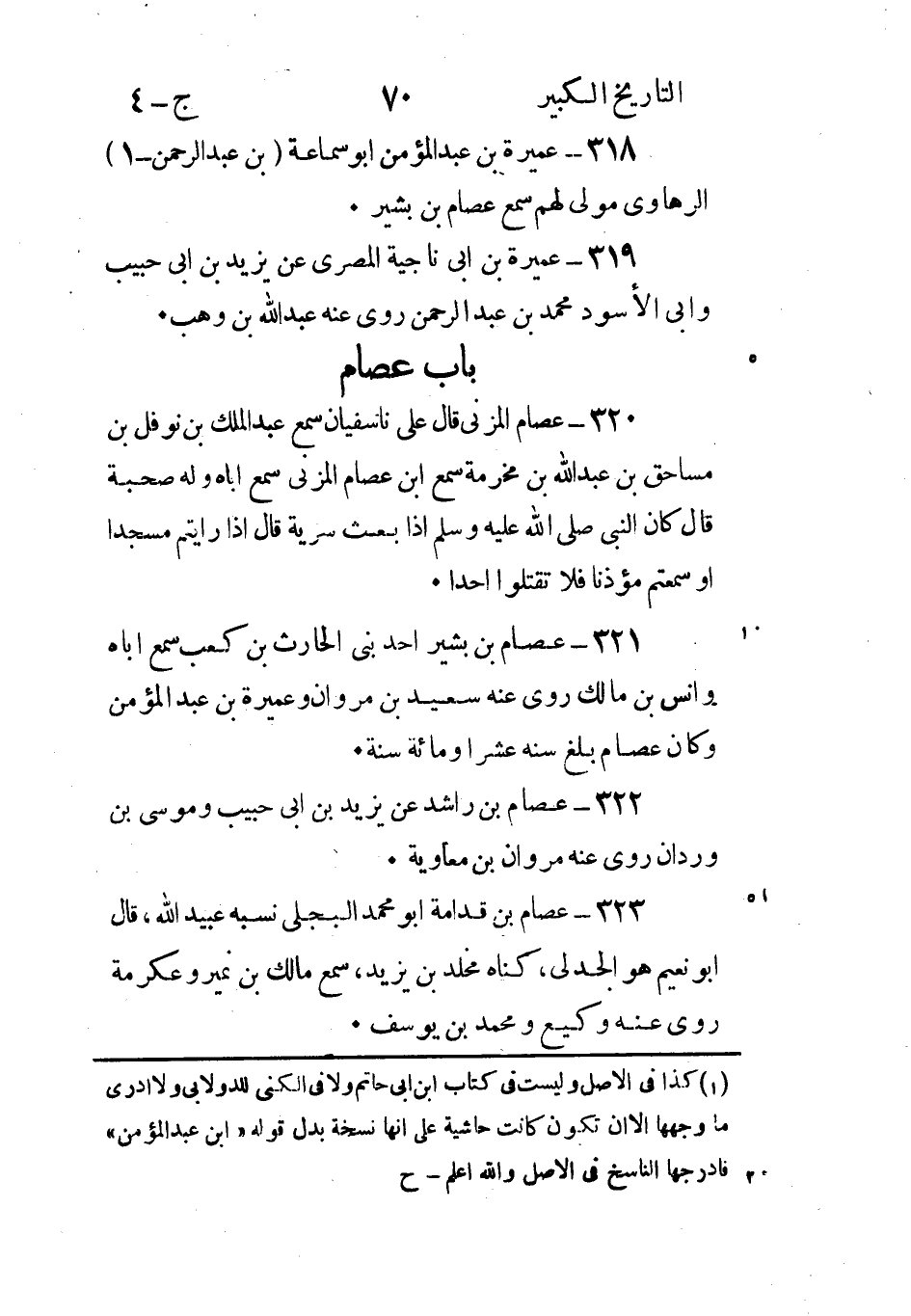 321 - عصام بْن بشير أحد بَنِي الحارث بْن كعب سَمِعَ أباه وأنس بْن مالك روى عَنْهُ سَعِيد بْن مروان وعميرة بْن عَبْد المؤمن وكَانَ عصام بلغ سنة عشرا ومائة سنة.