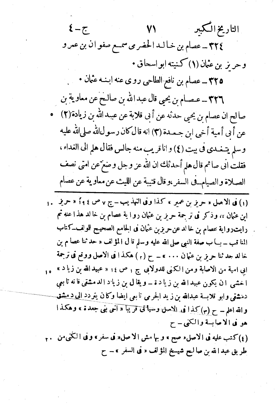 ابن عثمان،، وذكر في ترجمة حريز بن عثمان رواية عصام بن خالد هذا عنه ثم رايت رواية عصام بن خالد عن حريز بن عثمان في الجامع الصحيح للمولف - كتاب المناقب - باب صفة النَّبِيّ صَلَّى اللَّهُ عَلَيْهِ وَسَلَّمَ قَالَ المؤلف (حدثنا عصام بن خالد حدثنا حريز بن عثمان..) - ح (2) هكذا في الاصل ووقع في ترجمة ابى امية من الاصابة ومن الكنى للدولابي ج 1 ص 14 (عبيد الله بن زياد) اخشى ان يكون عبيد الله بن زيادة - ويقال بن زياد الدمشقي فانه تابعي دمشقي وابو قلابة عبد الله بن زيد الجرمى تابعي ايضا وكان يتردد إلى دمشق والله اعلم - ح (3) كذا في الاصل وسيأتى قريبا (اخى بنى جعدة) وهكذا هو في الاصابة والكنى - ح (4) كتب عليه في الاصل (صح) وبهامش الاصل (في سفر) وفى الكنى من طريق عبد الله بن صالح شيخ المؤلف (في السفر) - ح