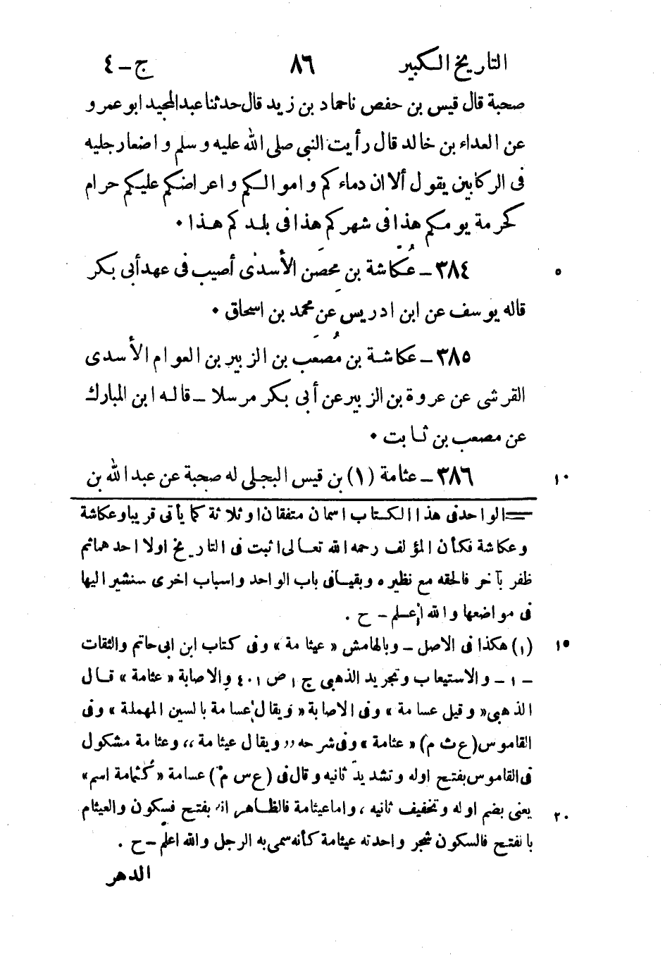 1 - والاستيعاب وتجريد الذهبي ج 1 ص 401 والاصابة (عثامة) قال الذهبي (وقيل عسامة) وفى الاصابة (ويقال عسامة بالسين المهملة) وفى القاموس (ع ث م) (عثامة) وفى شرحه،، ويقال عيثامة،، وعثامة مشكول في القاموس بفتح اوله وتشديد ثانيه وقال في (ع س م) عسامة (كثمامة اسم) يعنى بضم اوله وتخفيف ثانيه، واما عيثامة فالظاهر انه بفتح فسكون والعيثام بالفتح فالسكون شجر واحدته عيثامة كأنه سمى به الرجل والله اعلم - ح.