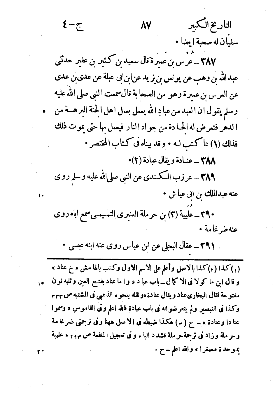 (1) كذا (2) كذا بالاصل وأعلم على الاسم الاول وكتب بالهامش (خ عناد) وقال ابن ماكولا في الاكمال - باب عباد (واما عناد بفتح العين وتليه نون مفتوحة فقال البخاري عناد ويقال عنادة، ونقله بنحوه الذهبي في المشتبه ص 333 وكذا في التبصير ولم يتعرضوا له في باب عبادة فالله اعلم وفى القاموس (وسموا عنادا وعنادة) - ح (3) هكذا ضبطه في الاصل ههنا وفى ترجمتي ضرغامة وحرملة وزاد في ترجمة حرملة فشدد الباء وفى تعجيل المنفعة ص 293 (عليبة بموحدة مصغرا) والله اعلم - ح.