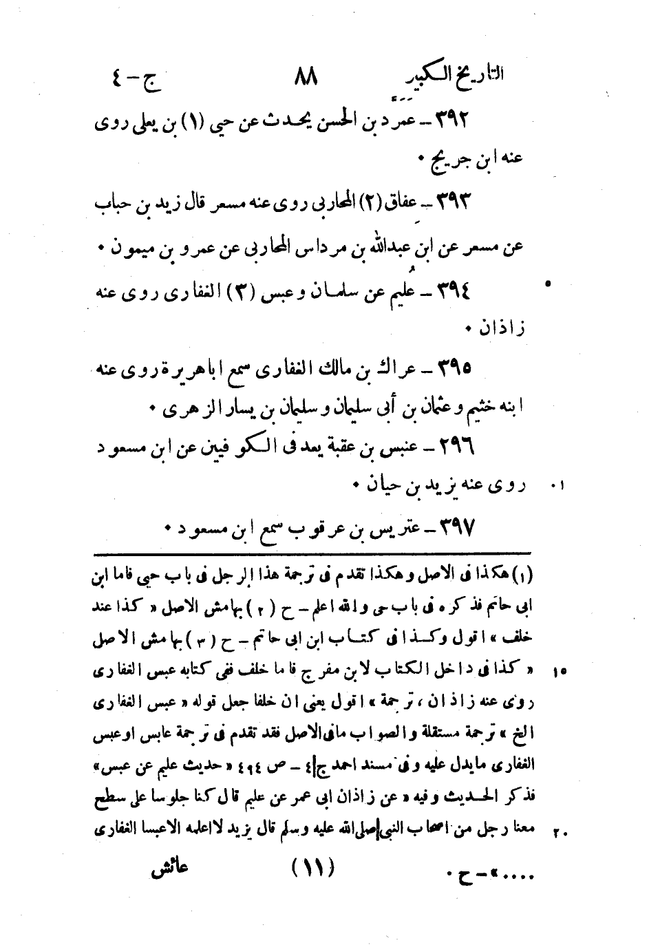 (1) هكذا في الاصل وهكذا تقدم في ترجمة هذا الرجل في باب حيى فاما ابن ابى حاتم فذكره في باب حى والله اعلم - ح (2) بهامش الاصل (كذا عند خلف) اقول وكذا في كتاب ابن ابى حاتم - ح (3) بهامش الاصل (كذا في داخل الكتاب لابن مفرج فاما خلف ففى كتابه عبس الغفاري روى عنه زاذان، ترجمة) اقول يعنى ان خلف جعل قوله (عبس الغفاري الخ) ترجمة مستقلة والصواب ما في الاصل فقد تقدم في ترجمة عابس أو عبس الغفاري ما يدل عليه وفى مسند احمد ج