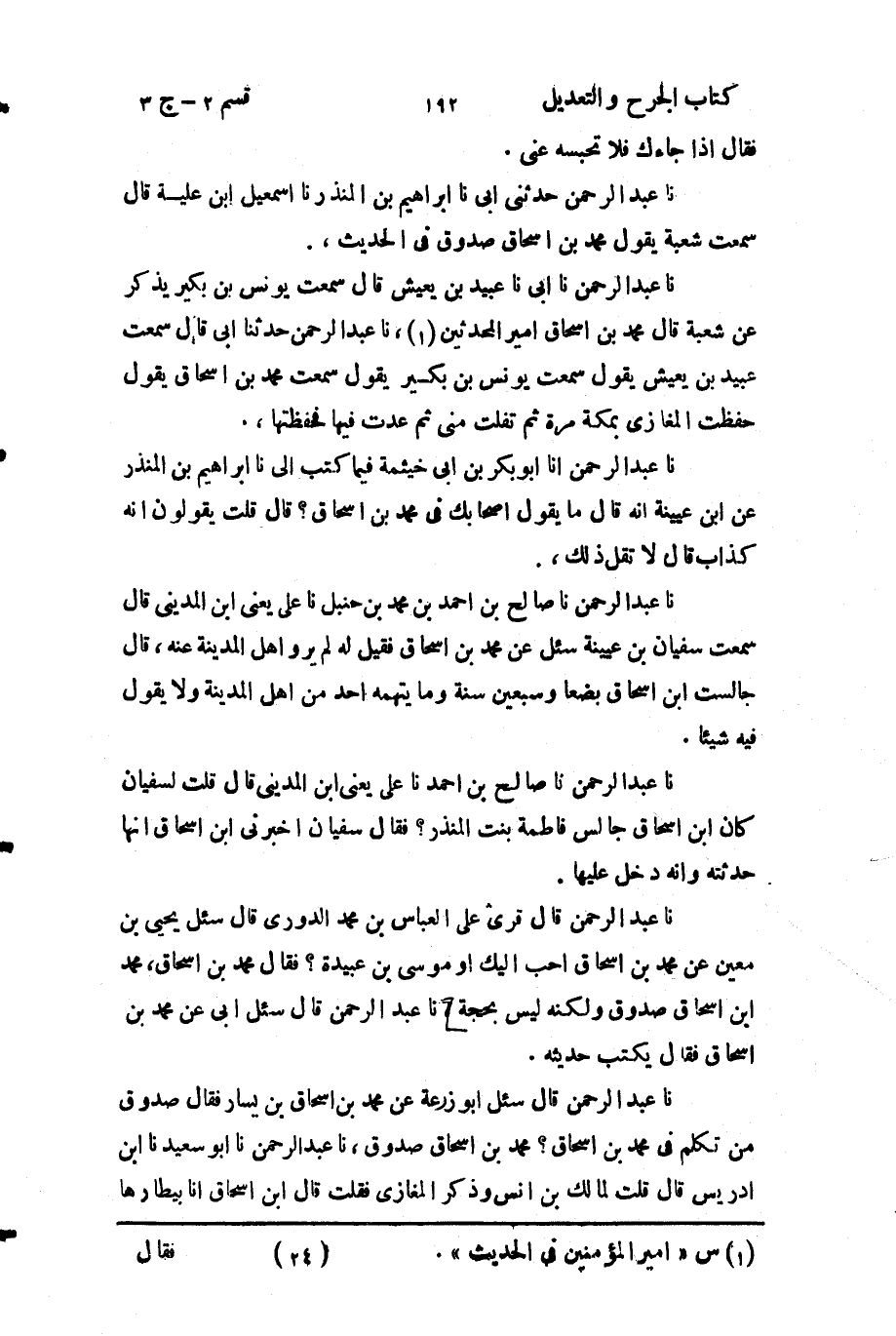 حَدثنا عَبد الرَّحمن، حَدثنا مسلم بن الحجاج النيسابوري، قال: حدثني إِسحاق بن راهويه قال: حَدثنا يَحيَى بن آدم قال: حَدثنا ابن إدريس قال: كنت عند مالك بن أَنس، وقال له رجل: يا أَبَا عَبد الله، إني كنت بالرَّي عند أبي عُبَيد الله، وثم محمد بن إِسحاق، فقال مُحمد بن إِسحاق: أعرضوا علي علم مالك، فإِني أَنا بيطاره، فقال مالك دجال من الدجاجلة، يقول: أعرضوا على علمي.