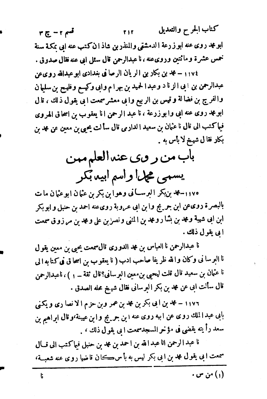 - باب من رُوي عنه العلم، مِمَّن يُسَمَّى محمدًا، واسم أَبيه بكر.