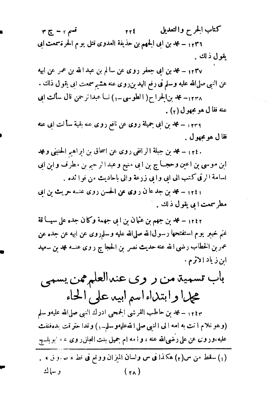 - باب تسمية من رُوي عنه العلم، مِمَّن يُسَمَّى محمدًا، وإبتداء اسم أَبيه على الحاء.