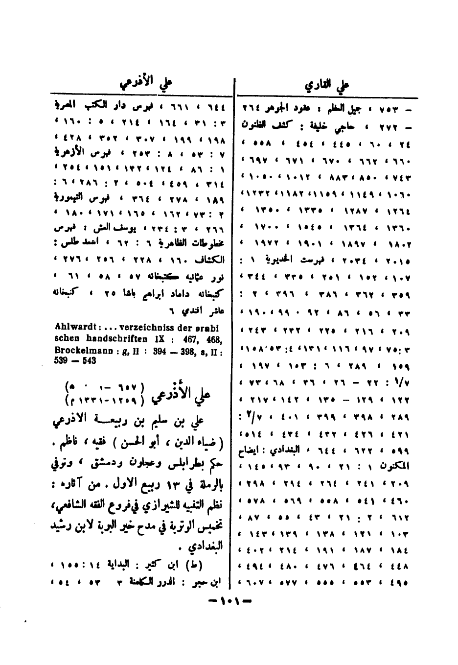 266، 3: 234، يوسف العش: فهرس مخطوطات الظاهرية 6: 62، احمد طلس: الكشاف 160، 228، 256، 276، نور عثمانية كتبخانه 57، 58، 61، كتبخانه داماد ابراهيم باشا 25، كتبخانه عاشر افندي 6 Ahlwardt:..verzeichniss der arabi , 468 , 467: schen handschriften IX: Brockelmann: g , II: 493 , 893 , s , II 543 - 539 علي الاذرعي (657 -؟ ؟ ؟ ؟ هـ) (1259 - 1331 م) علي بن سليم بن ربيعة الاذرعي (ضياء الدين، أبو الحسن) فقيه، ناظم.