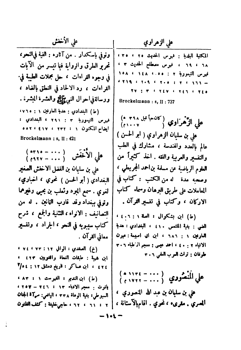 المكتبة البلدية: فهرس الحديث 25، 35، 68، 69، فهرس مصطلح الحديث 3، فهرس التيمورية 2: 55، 148، 158، - 161، 2: 205، 209، 219، 245، 246، 247، 3: 27 737: Brockelmann: s , II علي الزهراوي (كان حيا قبل 398 هـ) (1007 م) علي بن سليمان الزهراوي (أبو الحسن) عالم بالعدد والهندسة، مشارك في الطب والتفسير والعربية والفقه.