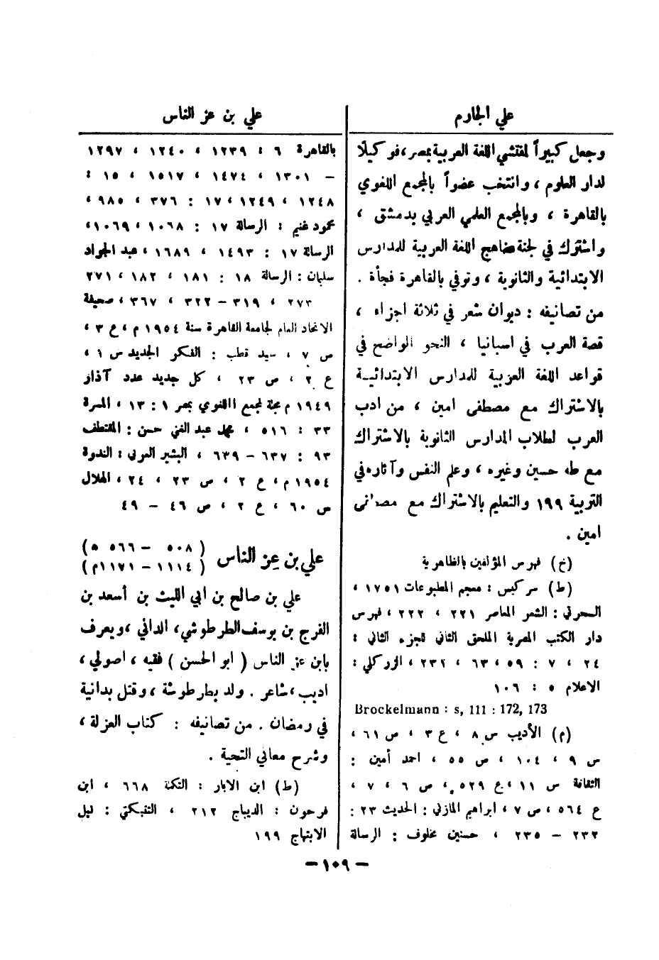 محمود غنيم: الرسالة 17: 1493، 1689، عبد الجواد سليمان: الرسالة 18: 181، 182، 271 273، 319 - 322، 367، صحيفة الاتحاد العام لجامعة القاهره سنة 1954 م، ع 3، ص 7، سيد قطب: الفكر الجديد س 1، ع 2، ص 23، كل جديد عدد آذار 1949 م مجلة المجمع اللغوي بمصر 1: 13، المسرة 33: 516، محمد عبد الغني حسن: المقتطف 93: 637 - 639، البشير العربي: الندوة 1954 م، ع 2، ص 23، 24، الهلال ص 60، ع 2، ص 46 - 49 علي بن عز الناس (508 - 566 هـ) (1114 - 1171 م) علي بن صالح بن ابي الليث بن أسعد بن الفرج بن يوسف الطرطوشي، الدانى، ويعرف بابن عز الناس (أبو الحسن) فقيه، اصولي، اديب، شاعر.