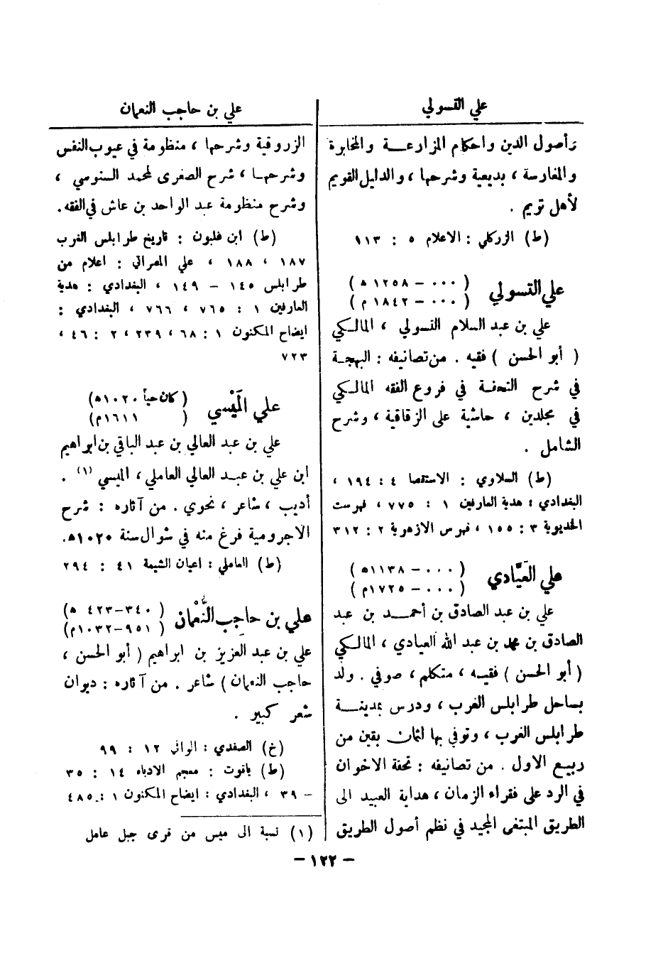(ط) الزر كلي: الاعلام 5: 113 علي التسولي (..- 1258 هـ) (..- 1842 م) علي بن عبد السلام التسولي، المالكي (أبو الحسن) فقيه.
