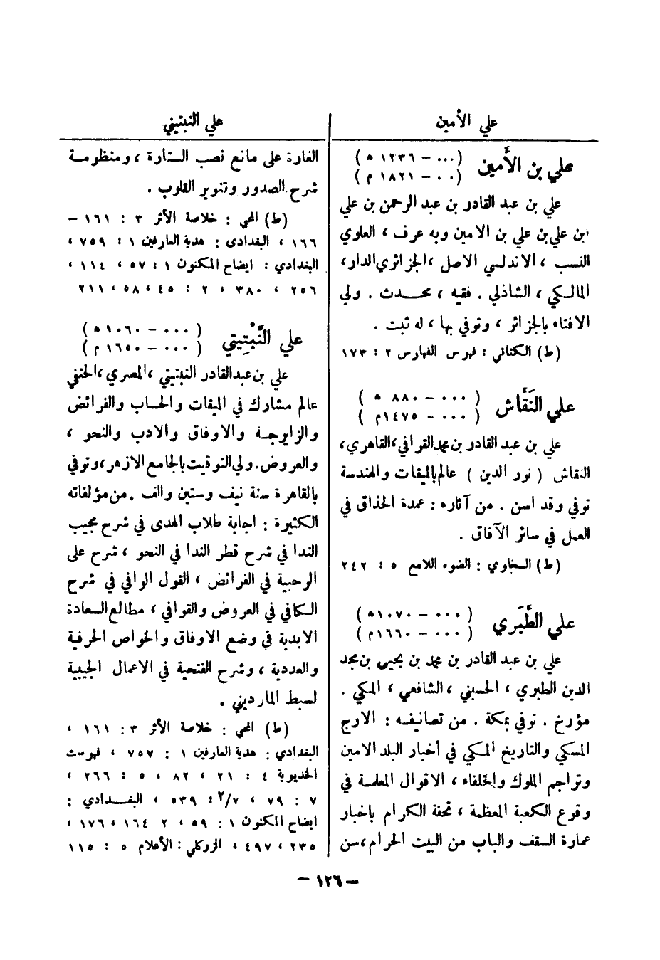 (ط) المحبي: خلاصة الاثر 3: 161 - 166، البغدادي: هدية العارفين 1: 759، البغدادي: ايضاح المكنون 1: 57، 114، 256، 380، 2: 45، 58، 211 علي النبتيتي (..- 1060 هـ) (..- 1650 م) علي بن عبد القادر النبتيتي، المصري، الحنفي عالم مشارك في الميقات والحساب والفرائض والزايرجة والاوفاق والادب والنحو، والعروض.