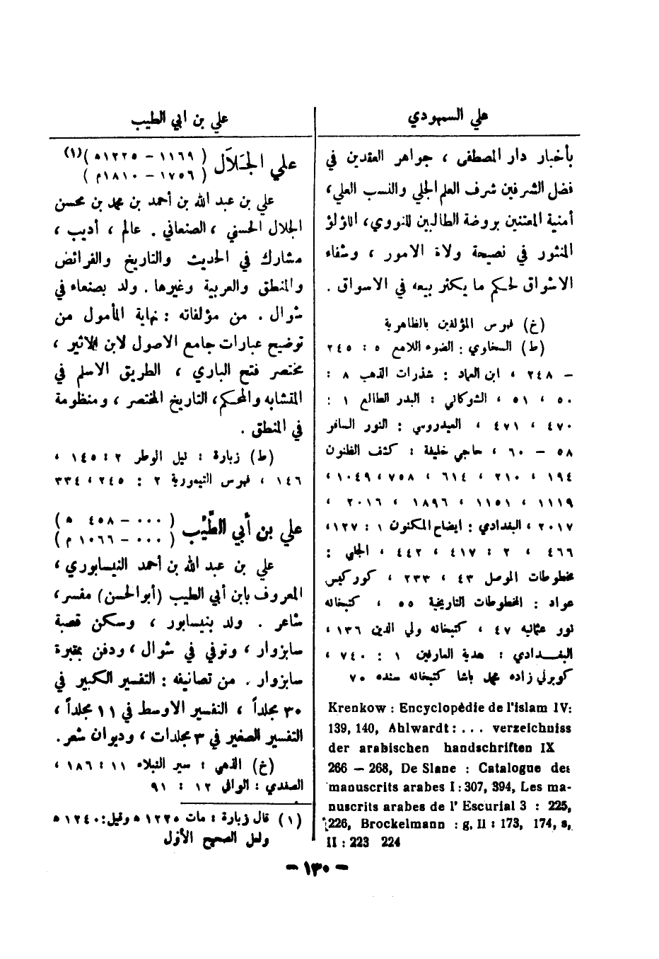 - 248، ابن العماد: شذرات الذهب 8: 50، 51، الشوكاني: البدر الطالع 1: 470، 471، العيدروسي: النور السافر 58 - 60، حاجي خليفة: كشف الظنون 194، 210، 614، 758، 1049، 1119، 1151، 1896، 2016، 2017، البغدادي: ايضاح المكنون 1: 127، 466، 2: 417، 442، الجلبي: مخطوطات الموصل 43، 233، كوركيس عواد: المخطوطات التاريخية 55، كتبخانه نور عثمانيه 47، كتبخانه ولي الدين 136، البغدادي: هدية العارفين 1: 740، كوبرلي زاده محمد باشا كتبخانه سنده 70: Krenkow: Encyclopedie de l ' islam IV 931 , 041 , Ahlwardt:..verzeichniss der arabischen handschriften IX 662 - 862 , De Slane: Catalogue des - manuscrits arabes I: 703 , 493 , Les ma , 225: 3 nuscrits arabes de l ' Escurial , 622 , Brockelmann: g , II: 371 , 471 , s 224 , 223: II علي الجلال (1169 - 1225 هـ) (1)