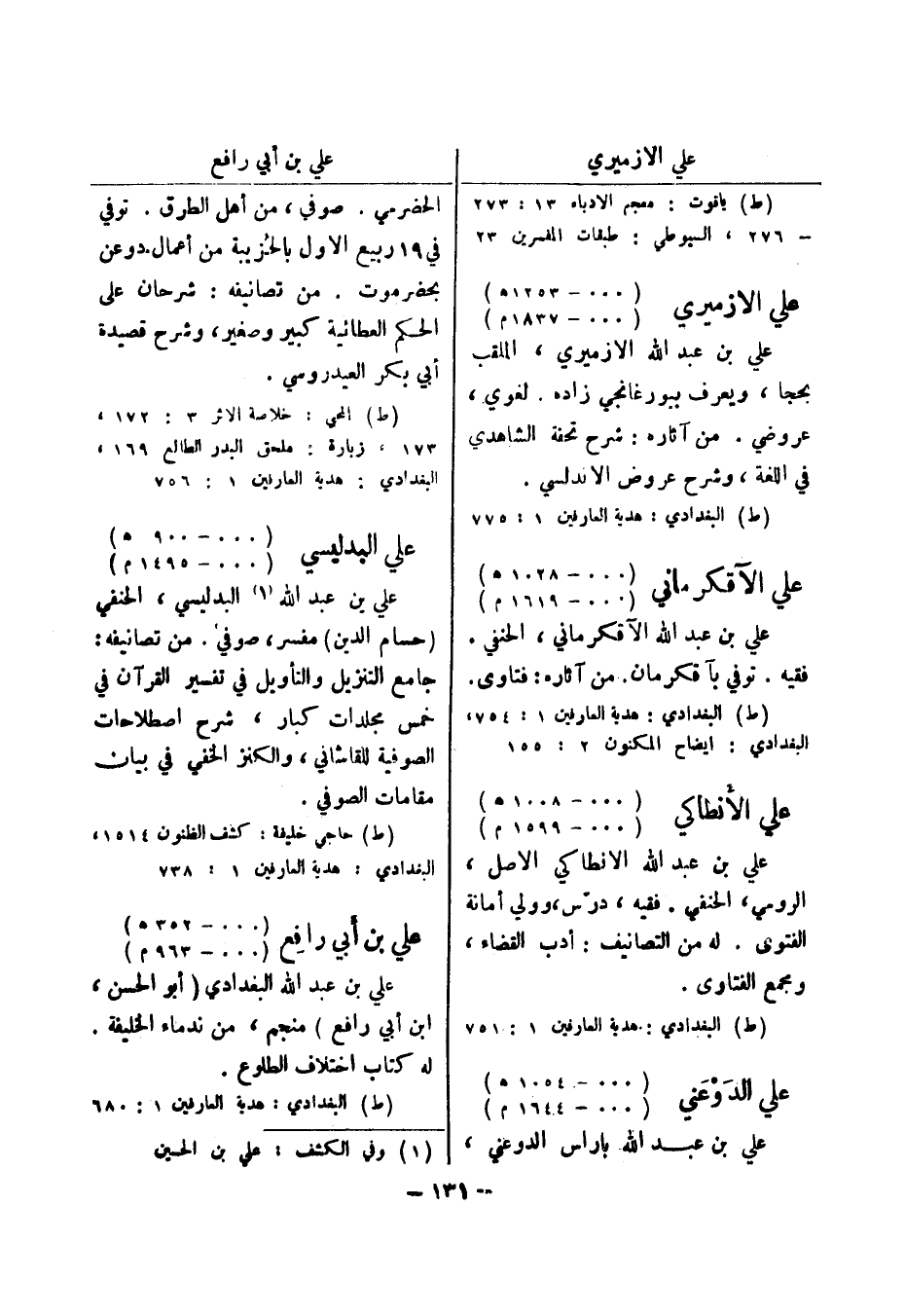 (ط) المحبي: خلاصة الاثر 3: 172، 173، زبارة: ملحق البدر الطالع 169، البغدادي: هدية العارفين 1: 756 علي البدليسي (..- 900 هـ) (..- 1495 م) علي بن عبد الله (1) البدليسى، الحنفي (حسام الدين) مفسر، صوفي.