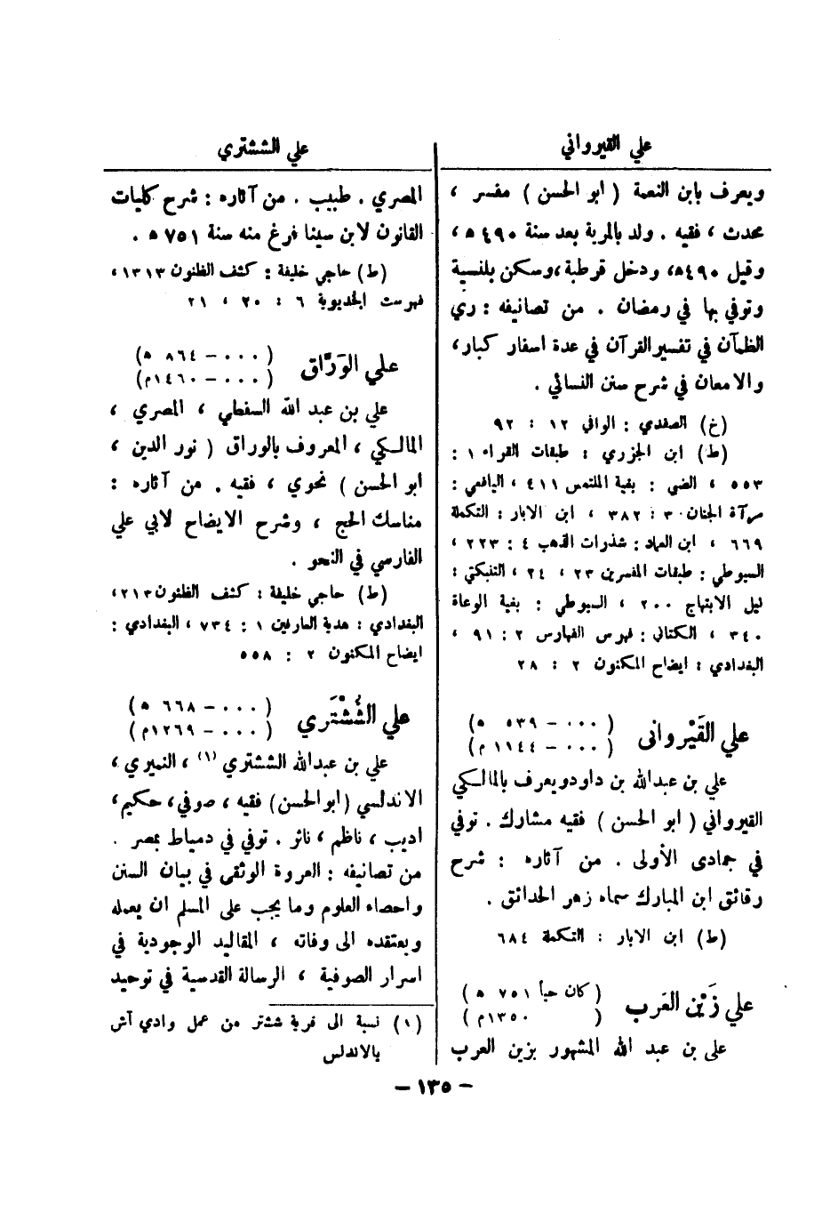 (ط) حاجي خليفة: كشف الظنون 1313، فهرست الخديوية 6: 20، 21 علي الوراق (..- 864 هـ) (..- 1460 م) علي بن عبد الله السفطي، المصري، المالكي، المعروف بالوراق (نور الدين، أبو الحسن) نحوي، فقيه.