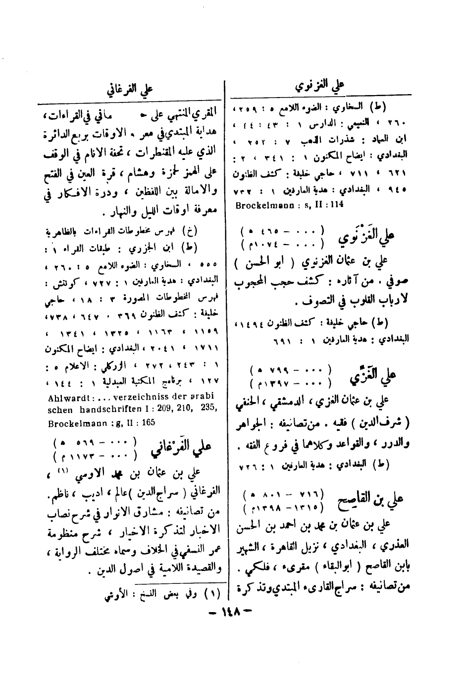 (ط) السخاوي: الضوء اللامع 5: 259، 260، النعيمي: الدارس 1: 43، 44، ابن العماد: شذرات الذهب 7: 252، البغدادي: ايضاح المكنون 1: 341، 2: 621، 711، حاجي خليفة: كشف الظنون 945، البغدادي: هدية العارفين 1: 732 114 ; Brockelmann: s , II علي الغزنوي (..- 465 هـ) (..- 1074 م) علي بن عثمان الغزنوي (أبو الحسن) صوفي.