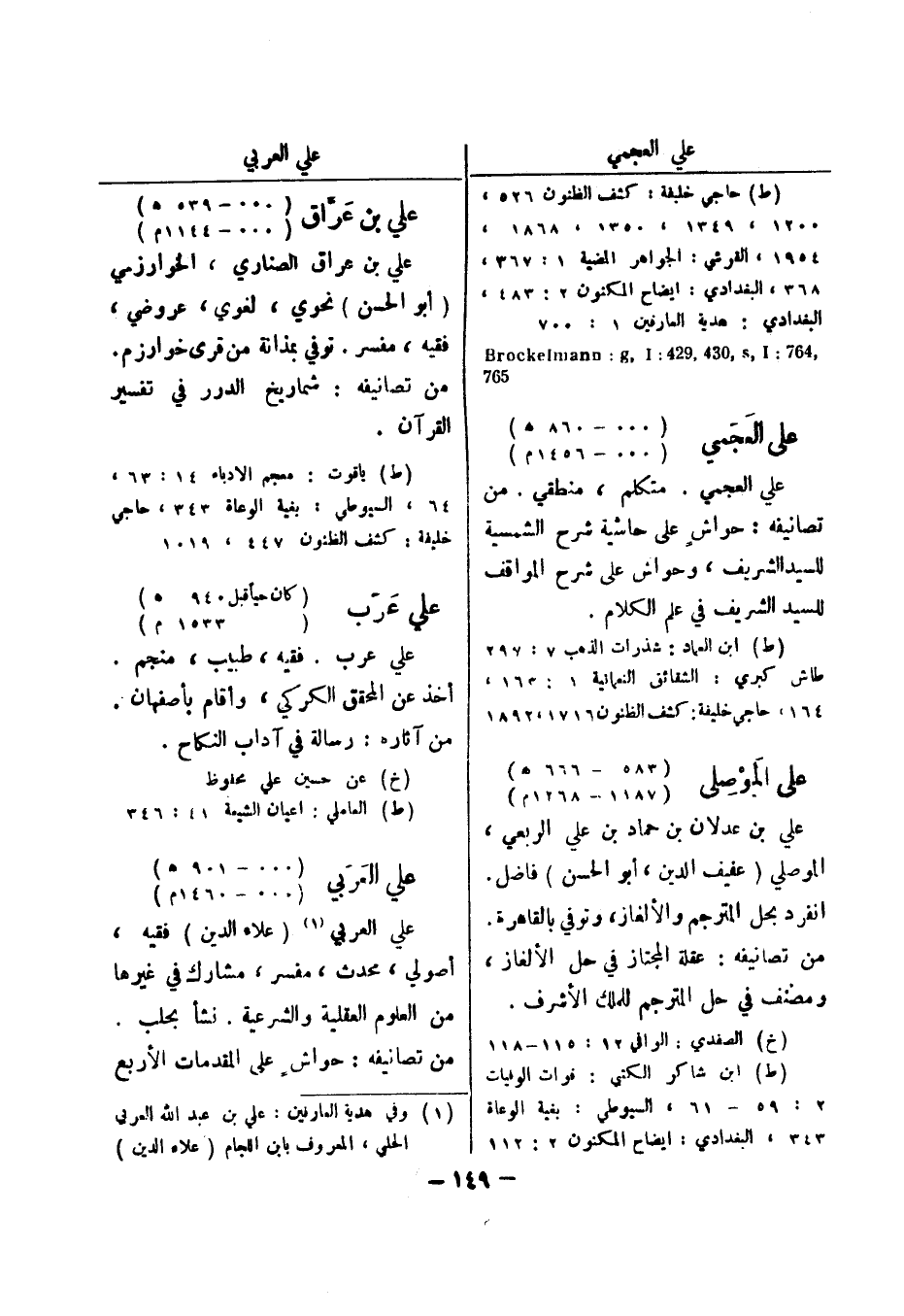 (ط) ابن العماد: شذرات الذهب 7: 297 طاش كبري: الشقائق النعمانية 1: 163، 164، حاجي خليفة: كشف الظنون 1716، 1892 علي الموصلي (583 - 666 هـ) (1187 - 1268 م) علي بن عدلان بن حماد بن علي الربعي، الموصلي (عفيف الدين، أبو الحسن) فاضل.