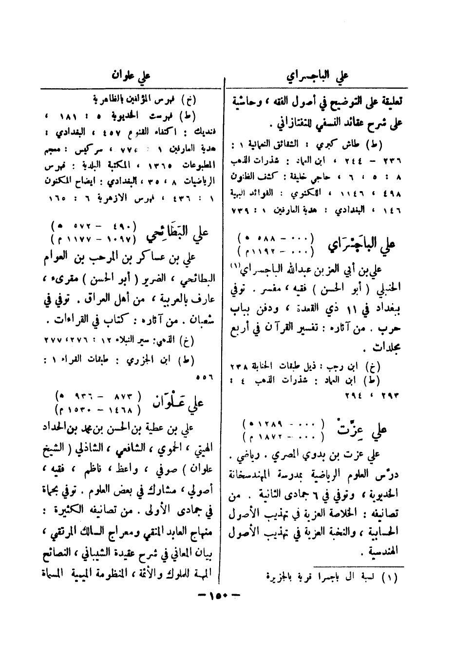 (ط) طاش كبري: الشقائق النعمانية 1: 236 - 244، ابن العماد: شذرات الذهب 8: 5، 6، حاجي خليفة: كشف الظنون 498، 1146، اللكنوي: الفوائد البهية 146، البغدادي: هدية العارفين 1: 739 علي الباجسراي (..- 588 هـ) (..- 1192 م) علي بن أبي العزبن عبد الله الباجسراي (1) الحنبلي (أبو الحسن) فقيه، مفسر.