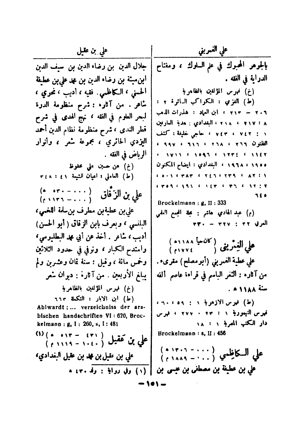 (ط) فهرس الازهرية 1: 59، 60، فهرس التميمورية 1: 23، 277، فهرس دار الكتب المصرية 1: 18 456: Brockelmann: s , II علي الكاظمي (.