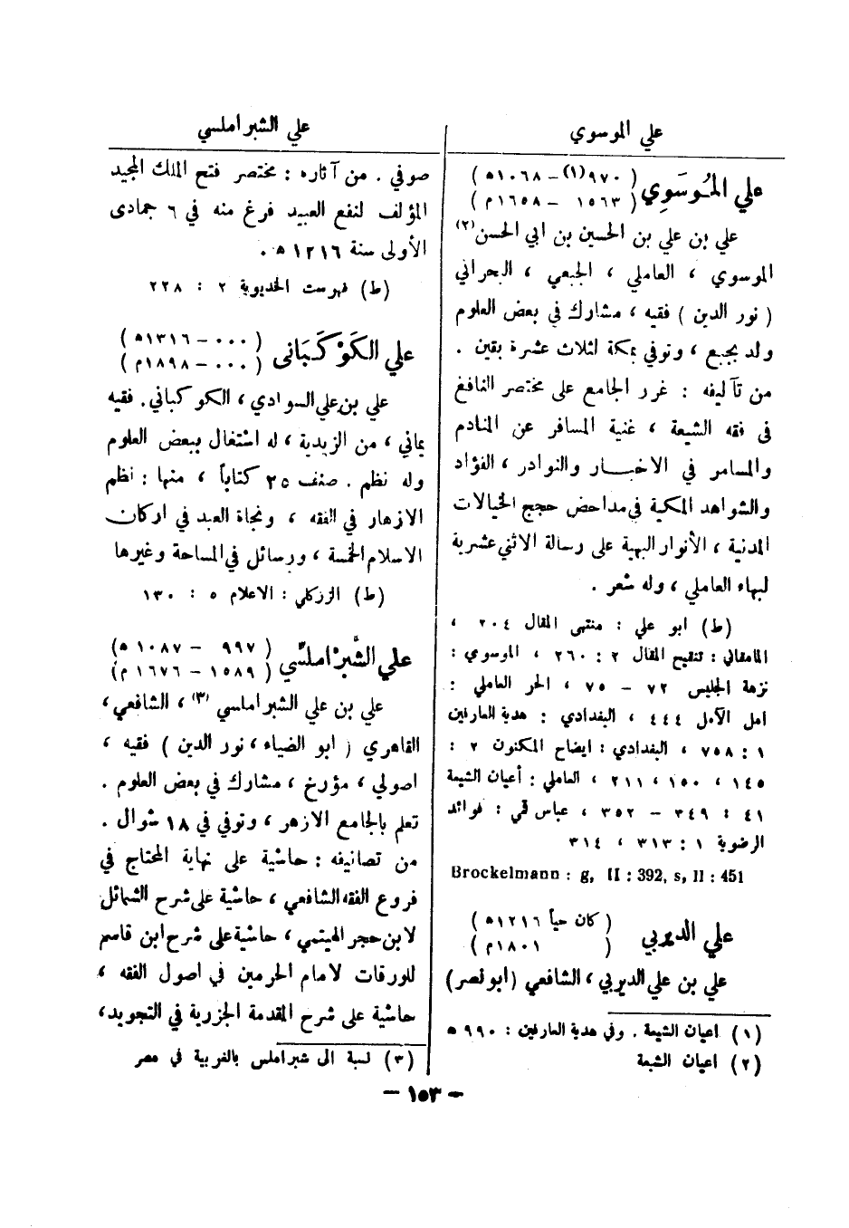 (ط) الزر كلي: الاعلام 5: 130 علي الشبراملسي (997 - 1087 هـ) (1589 - 1676 م) علي بن علي الشبراملسي (3) ، الشافعي، القاهري (أبو الضياء، نور الدين) فقيه، اصولي، مؤرخ، مشارك في بعض العلوم.