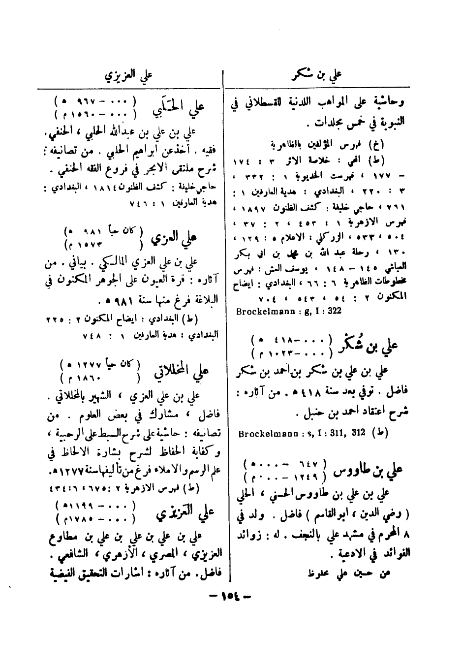 (ط) البغدادي: ايضاح المكنون 2: 225 البغدادي: هدية العارفين 1: 748 علي المخللاتي (كان حيا 1277 هـ) (1860 م) علي بن علي العزي، الشهير بالمخللاتي.