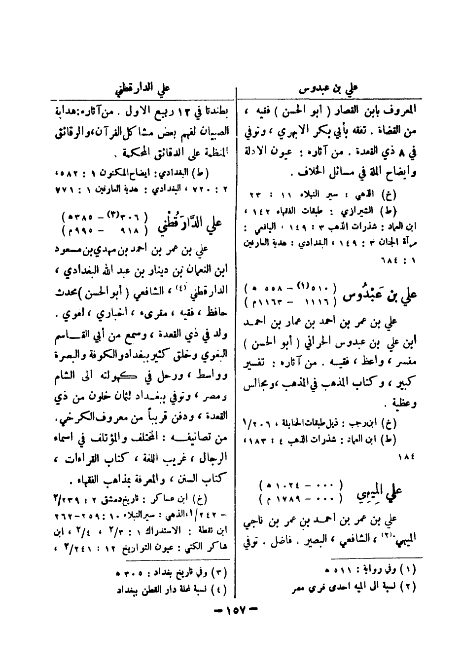 (ط) البغدادي: ايضاح المكنون 1: 582، 2: 720، البغدادي: هدية العارفين 1: 771 علي الدارقطني (306 (3) - 385 هـ) (918 - 995 م) علي بن عمر بن احمد بن مهدي بن مسعود ابن النعمان بن دينار بن عبد الله البغدادي، الدارقطني (4) ، الشافعي (أبو الحسن) محدث حافظ، فقيه، مقرئ، اخباري، لغوي.
