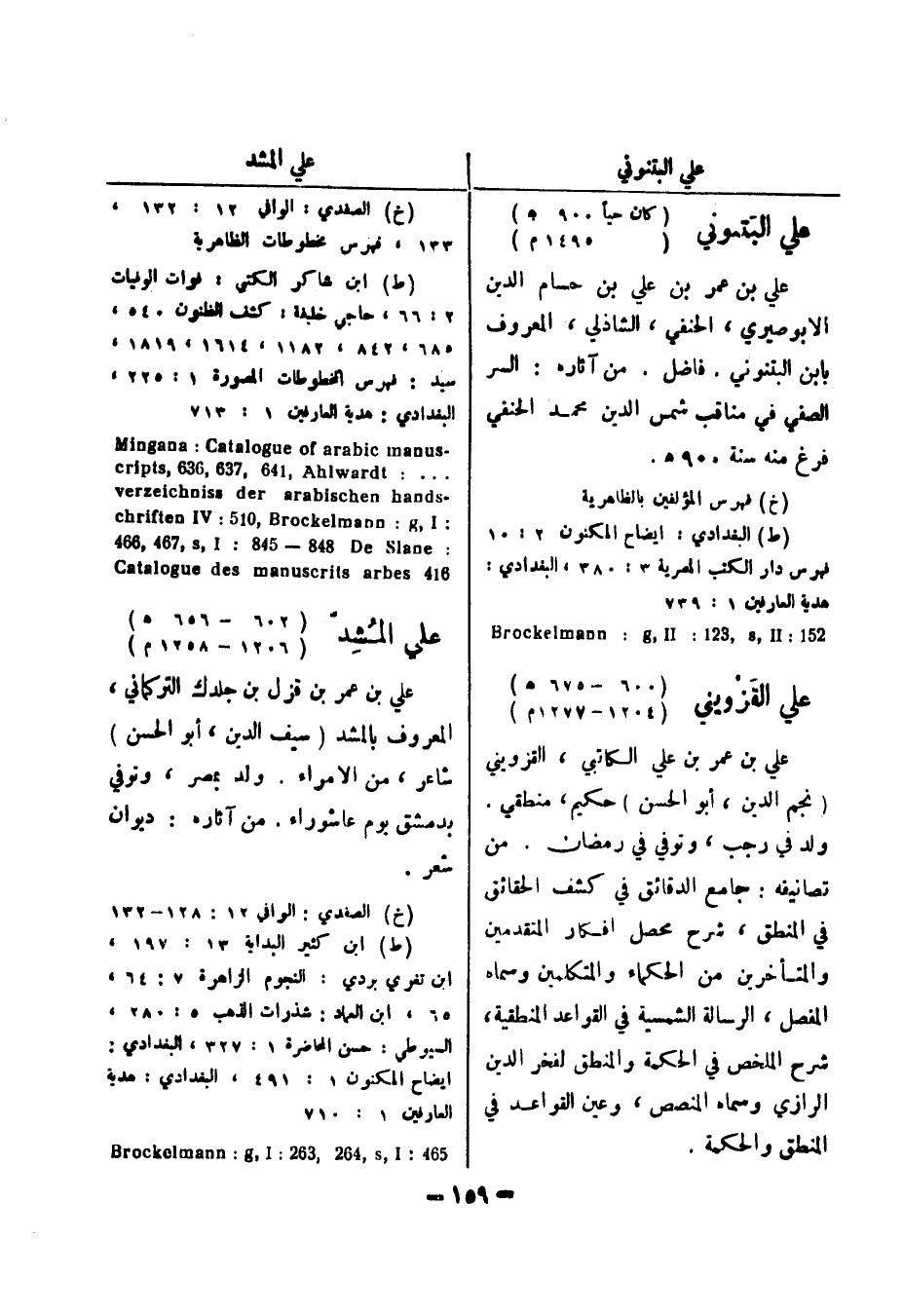 (خ) فهرس المؤلفين بالظاهرية (ط) البغدادي: ايضاح المكنون 2: 10 فهرس دار الكتب المصرية 3: 380، البغدادي: هدية العارفين 1: 739 152: Brockelmann: g , II: 231 , s , II علي القزويني (600 - 675 هـ) (1204 - 1277 م) علي بن عمر بن علي الكاتبي، القزويني (نجم الدين، أبو الحسن) حكيم، منطقي.