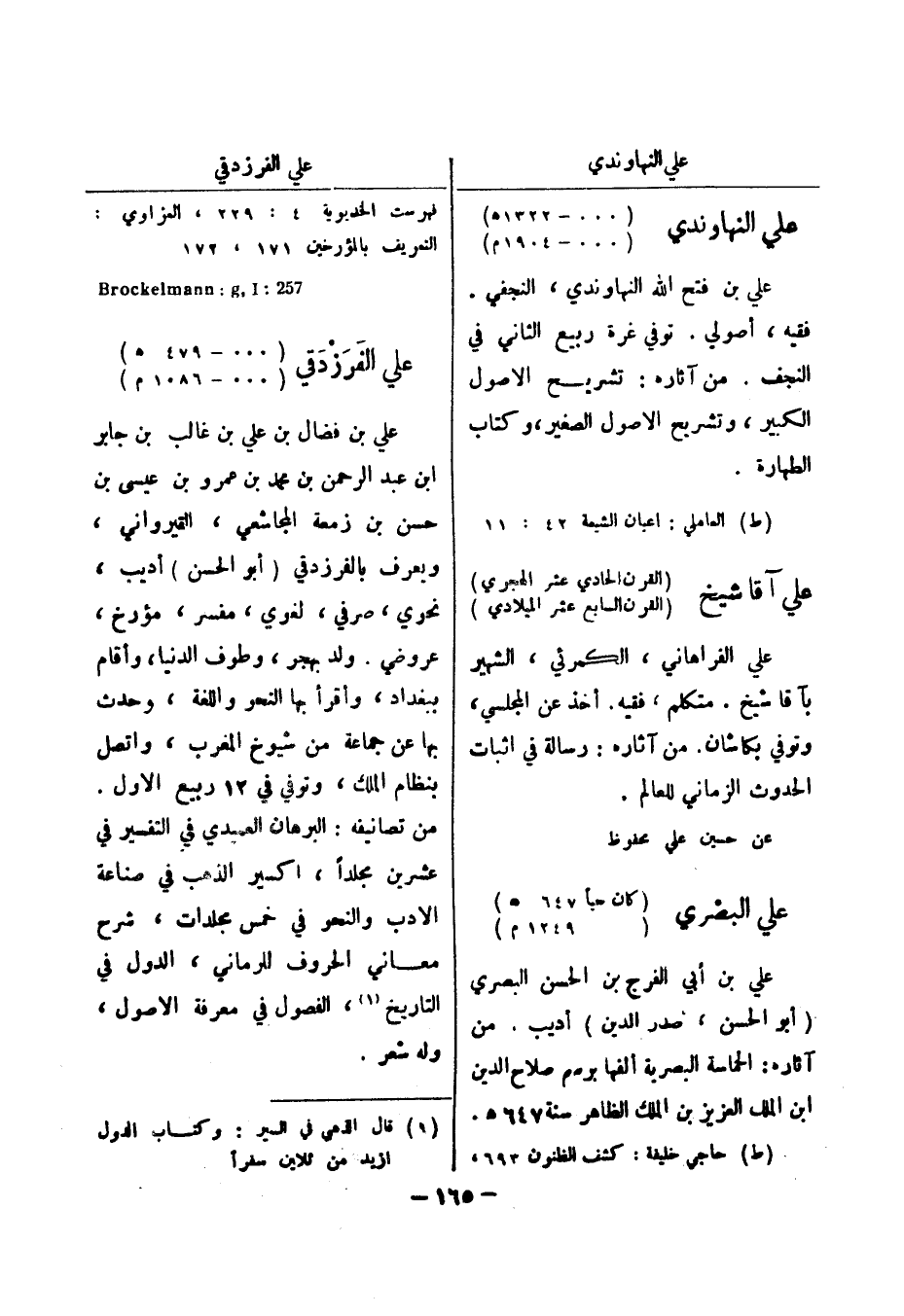 (ط) حاجي خليفة: كشف الظنون 693، فهرست الخديوية 4: 229، العزاوي: التعريف بالمؤرخين 171، 172 257: Brockelmann: g , I علي الفرزدقي (..- 479 هـ) (..- 1086 م)