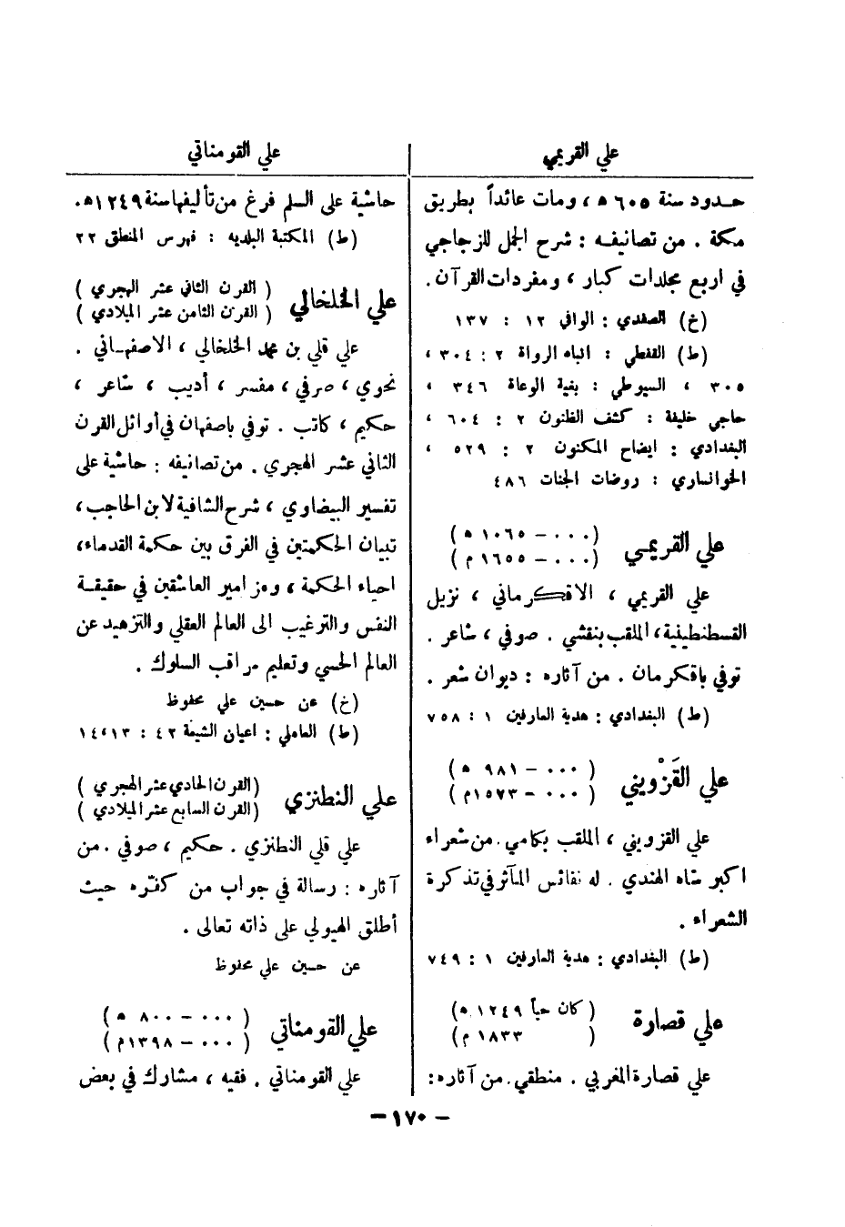 (خ) الصفدي: الوافي 12: 137 (ط) القفطي: انباه الرواة 2: 304، 305، السيوطي: بغية الوعاة 346، حاجي خليفة: كشف الظنون 2: 604، البغدادي: ايضاح المكنون 2: 529، الخوانساري: روضات الجنات 486 علي القريمي (..- 1065 هـ) (..- 1655 م) علي القريمي، الاقكرماني، نزيل القسطنطينية، الملقب بنقشي.