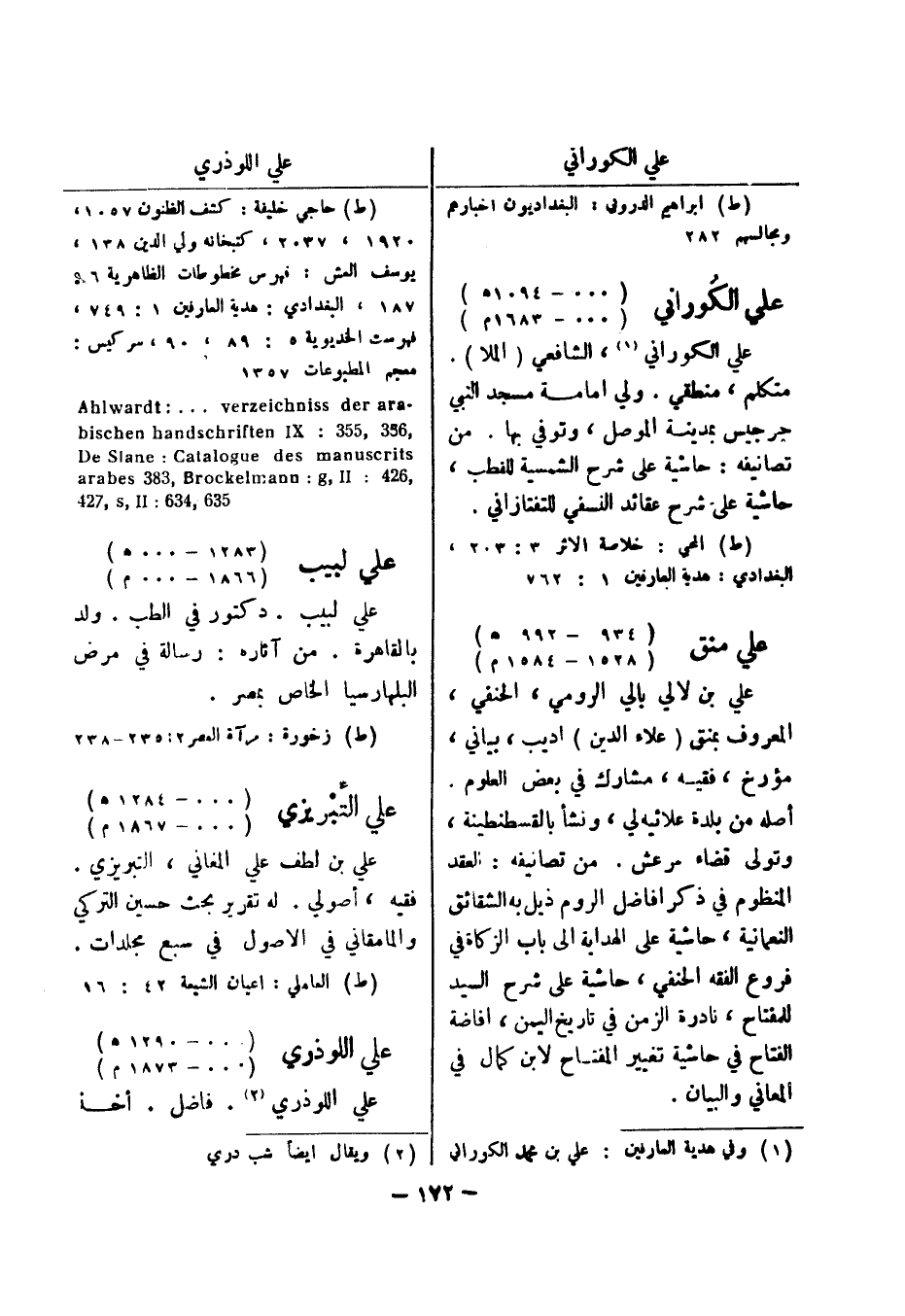 (ط) ابراهيم الدروني: البغداديون اخبارهم ومجالسهم 282 علي الكوراني (..- 1094 هـ) (..- 1683 م) علي الكوراني (1) ، الشافعي (الملا) .