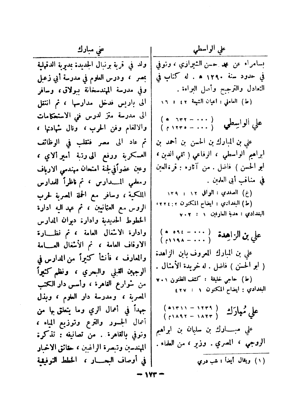 (ط) حاجي خليفة: كشف الظنون 701 البغدادي: ايضاح المكنون 1: 427 علي مبارك (1239 - 1311 هـ) (1823 - 1892 م) علي مبارك بن سليمان بن ابراهيم