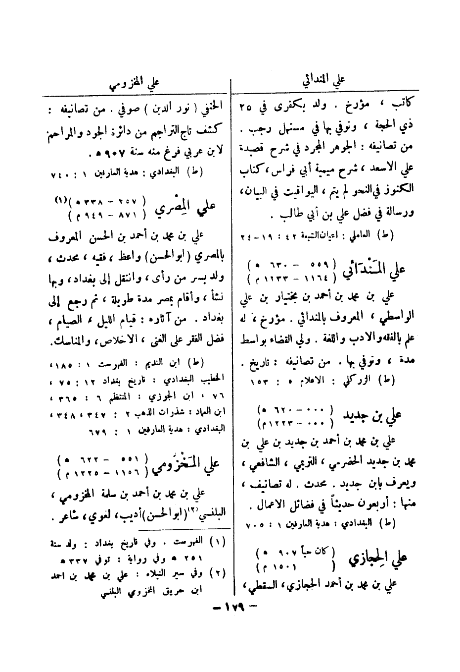 (ط) ابن النديم: الفهرست 1: 185، الخطيب البغدادي: تاريخ بغداد 12: 75، 76، ابن الجوزي: المنتظم 6: 365، ابن العماد: شذرات الذهب 2: 347، 348، البغدادي: هدية العارفين 1: 679 علي المخزومي (551 - 622 هـ)