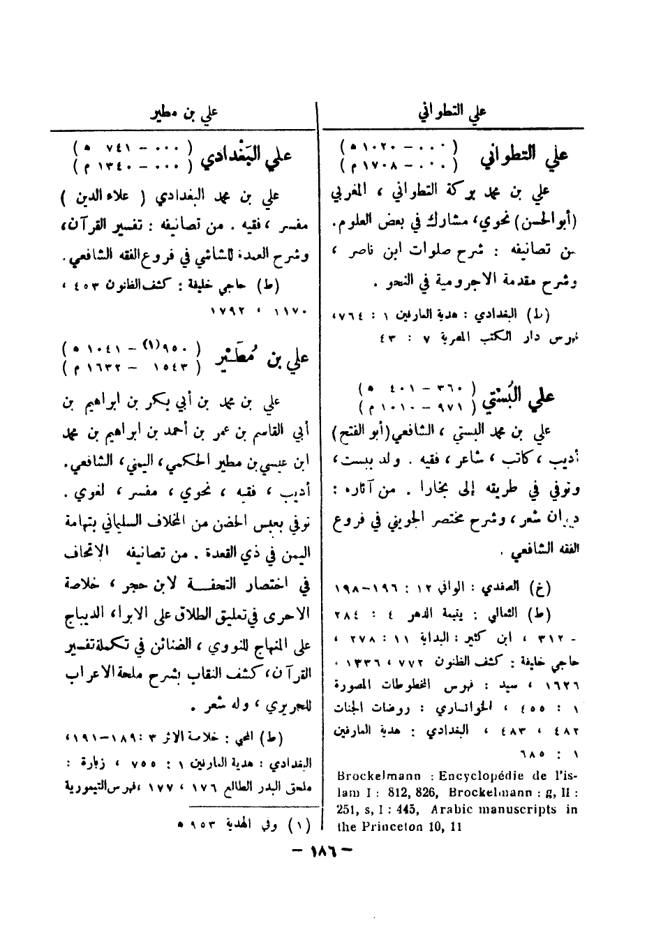 1626، سيد: فهرس المخطوطات المصورة 1: 455، الخوانساري: روضات الجنات 482، 483، البغدادي: هدية العارفين 1: 685 - Brockelmann: Encyclopedie de l ' is: lam I: 218 , 628 , Brockelmann: g , II 152 , s , I: 544 , Arabic manuscripts in 11 , 10 the Princeton علي البغدادي (..- 741 هـ) (..- 1340 م) علي بن محمد البغدادي (علاء الدين) مفسر، فقيه.