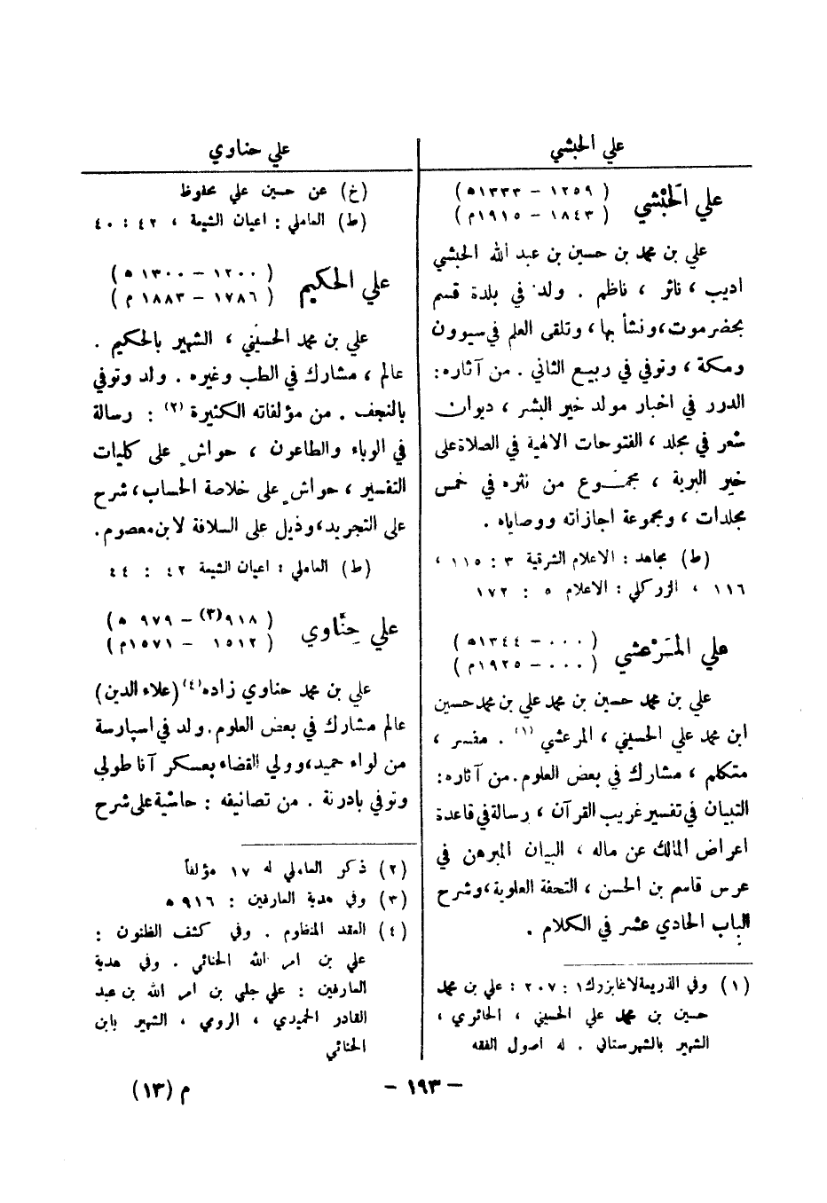 (ط) العاملي: اعيان الشيعة 42: 44 علي حناوي (918 (3) - 979 هـ) (1512 - 1571 م) علي بن محمد حناوي زاده (4) (علاء الدين) عالم مشارك في بعض العلوم.