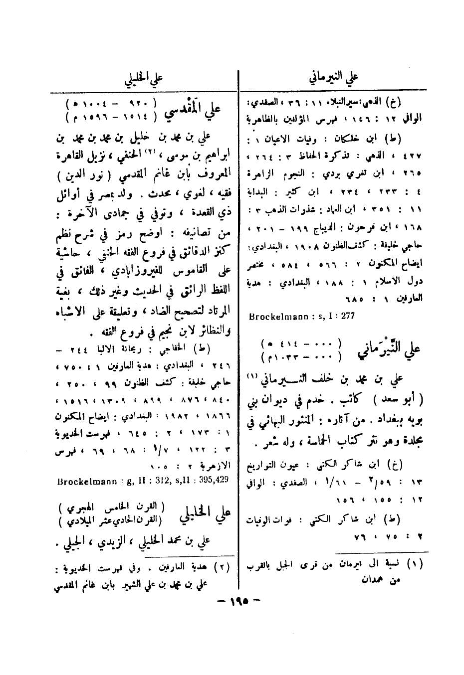 (خ) الذهبي: سير النبلاء 11: 36، الصفدي: الوافي 12: 156، فهرس المؤلفين بالظاهرية (ط) ابن خلكان: وفيات الاعيان 1: 427، الذهي: تذكرة الحفاظ 3: 264، 265، ابن تغري بردي: النجوم الزاهرة 4: 233، 234 ابن كثير: البداية 11: 351، ابن العماد: شذرات الذهب 3: 168، ابن فرحون: الديباج 199 - 201، حاجي خليفة: كشف الظنون 1908، البغدادي: ايضاح المكنون 2: 566، 584، مختصر دول الاسلام 1: 188، البغدادي: هدية العارفين 1: 685 277: Brockelmann: s , I علي النيرماني (..- 414 هـ) (..- 1033 م) علي بن محمد بن خلف النيرماني (1)