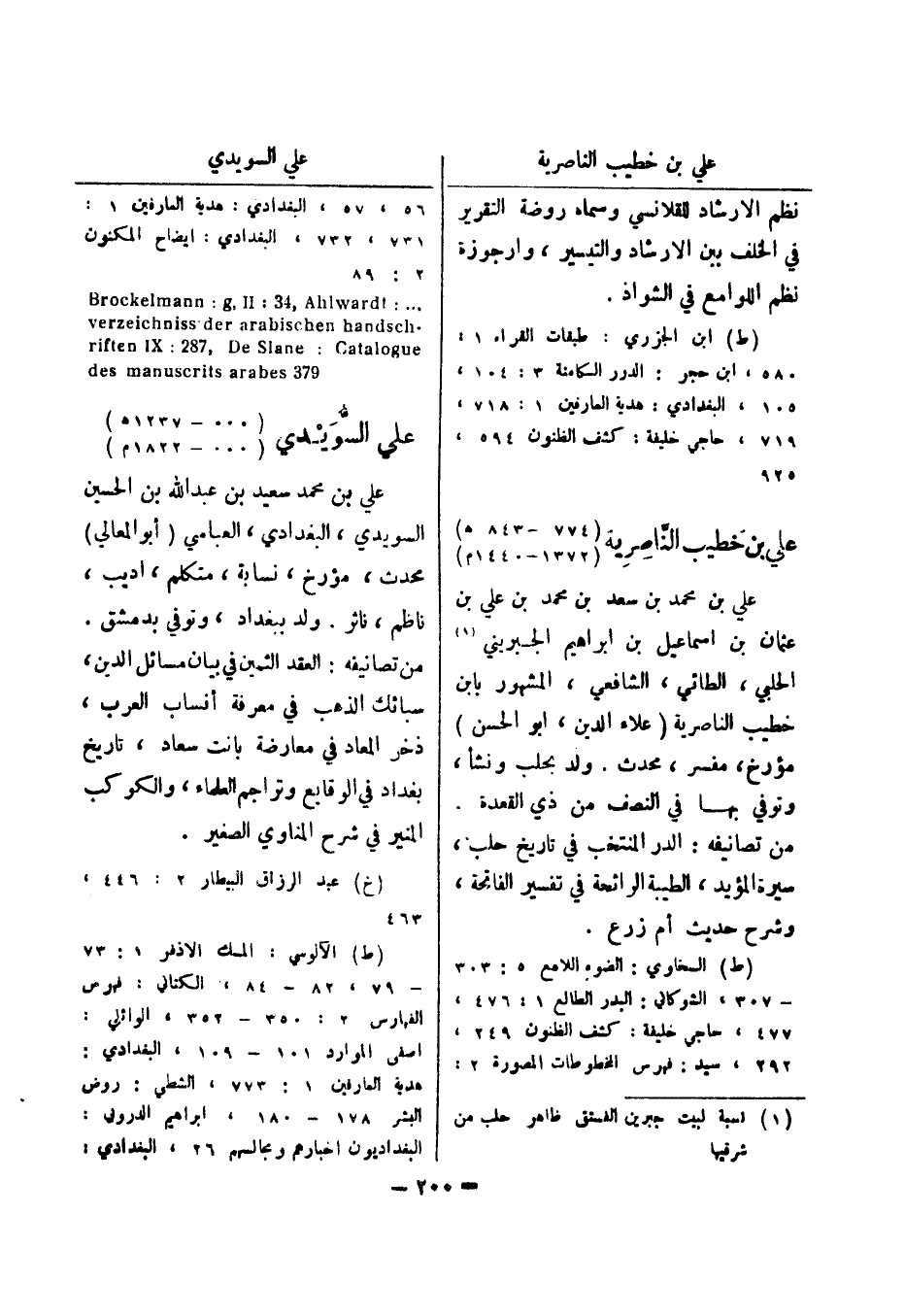 731، 732، البغدادي: ايضاح المكنون 2: 89..: Brockelmann: g , II ; 43 , Ahlwardt - verzeichniss der arabischen handsch riften IX: 782 , De Slane: Catalogue 379 des manuscrits arabes علي السويدي (..- 1237 هـ) (..- 1822 م) علي بن محمد سعيد بن عبد الله بن الحسين السويدي، البغدادي، العباسي (أبو المعالي) محدث، مؤرخ، نسابة، متكلم، اديب، ناظم، ناثر.
